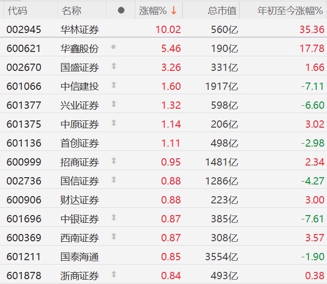 券商板块午后持续走高,华林证券率先涨停,华鑫股份涨超4%,国盛证券、中信建投、首创证券、兴业证券等个股跟涨。