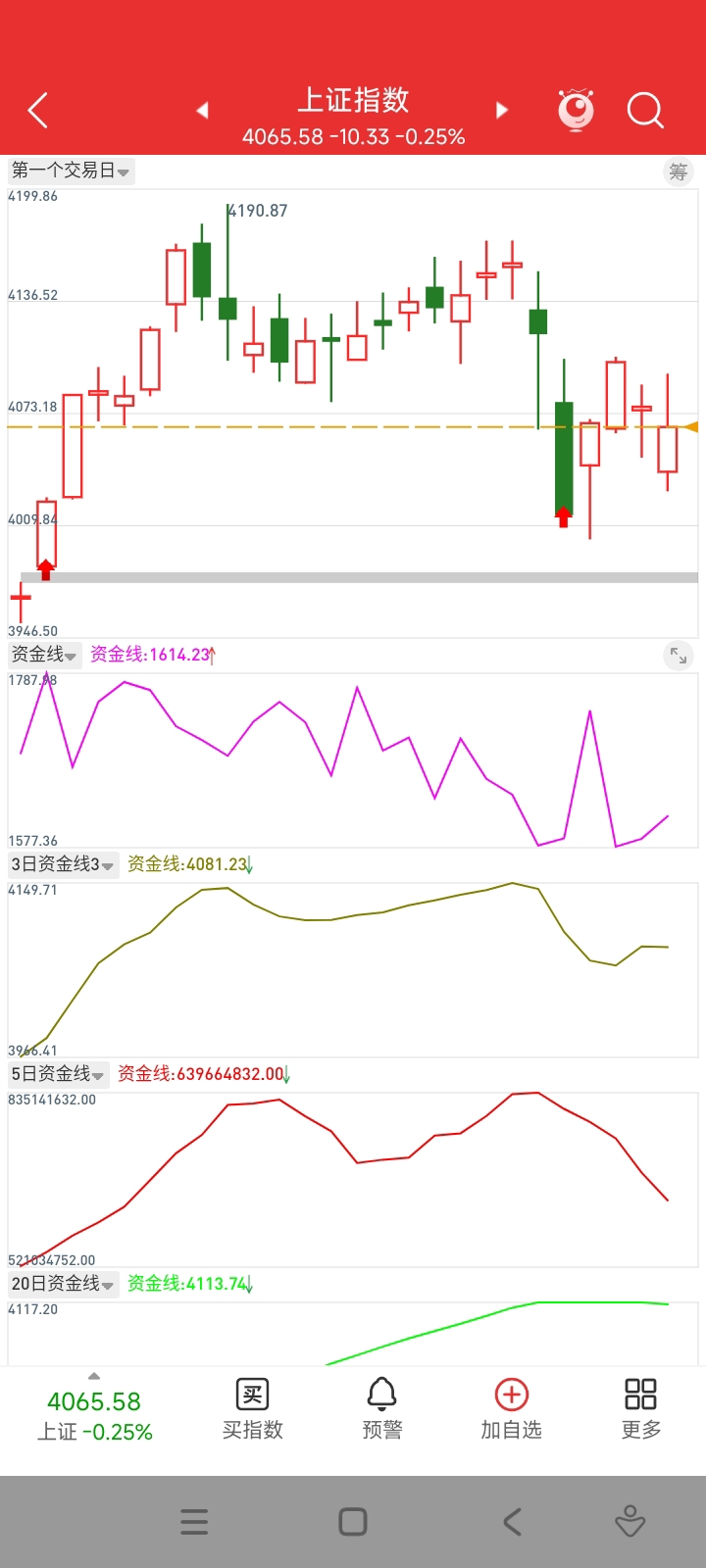 $上证指数(SH000001)$ 编写出资金线指标,可惜不能叠加。