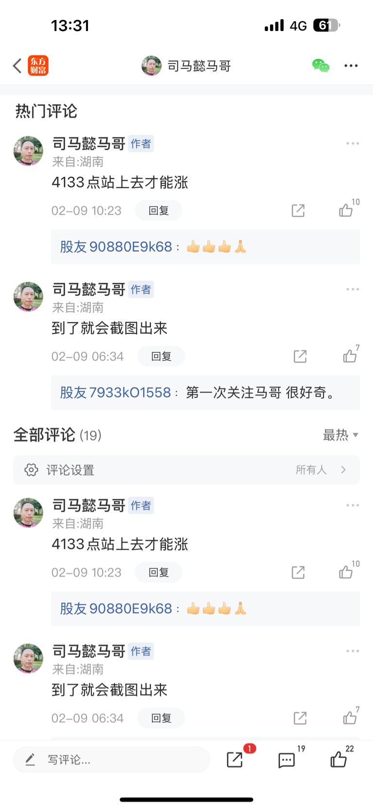 司马懿马哥昨天上午喊出4133点,大家来看截图,今天上午到达4134点,误差一个点,这个点位没有人抄袭。