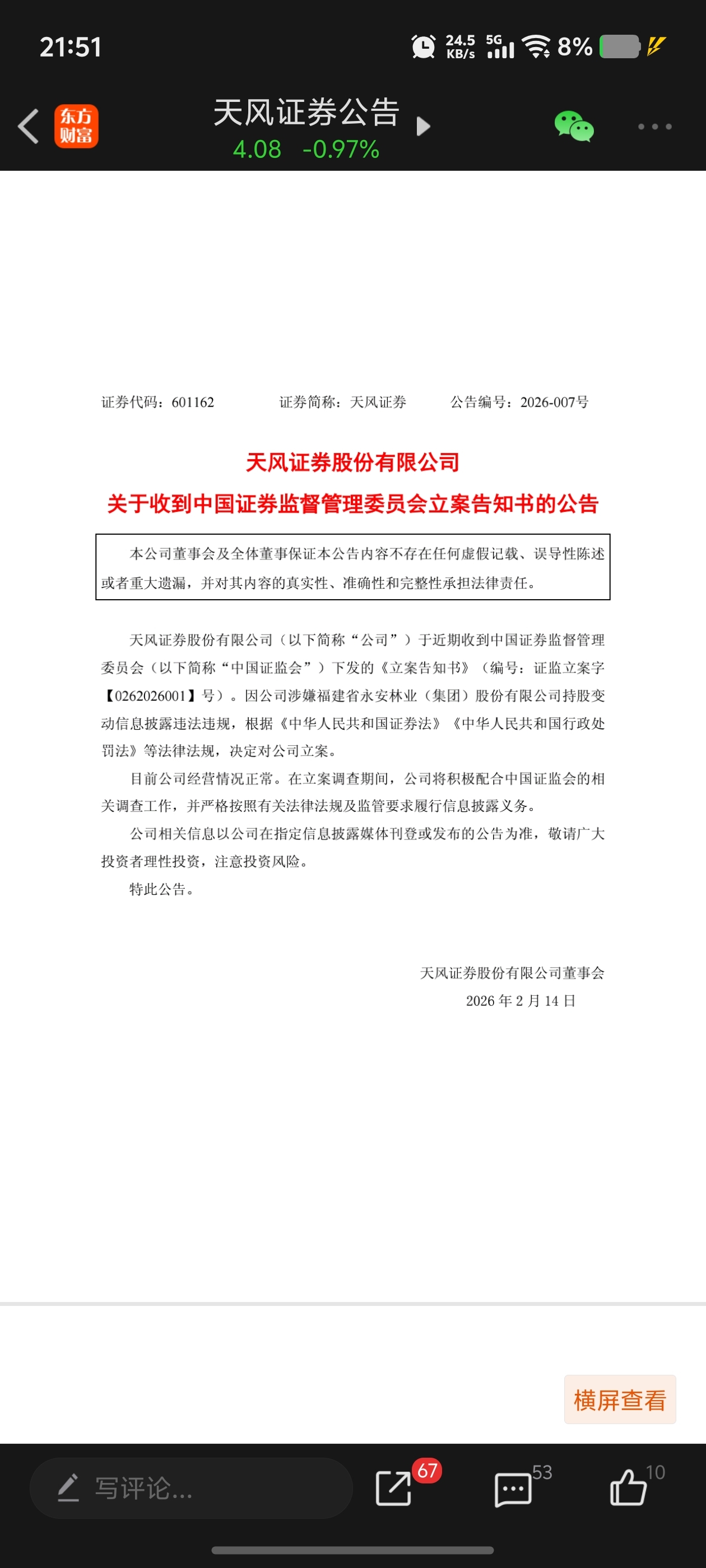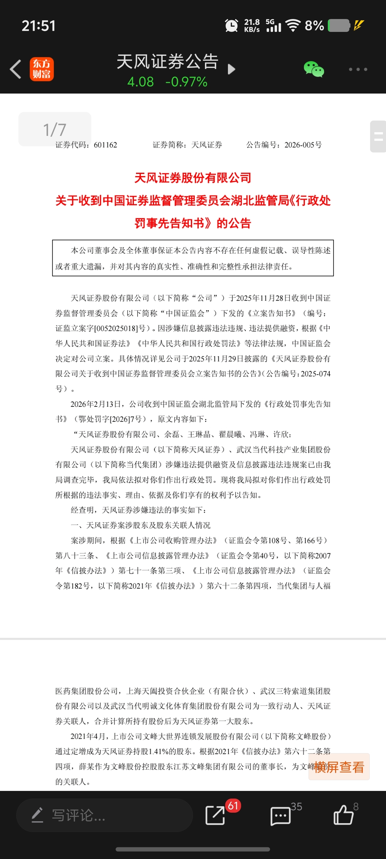 $天风证券(SH601162)$ 过年了,放假了,这时候被立案调查。的确让人挺恶心的。