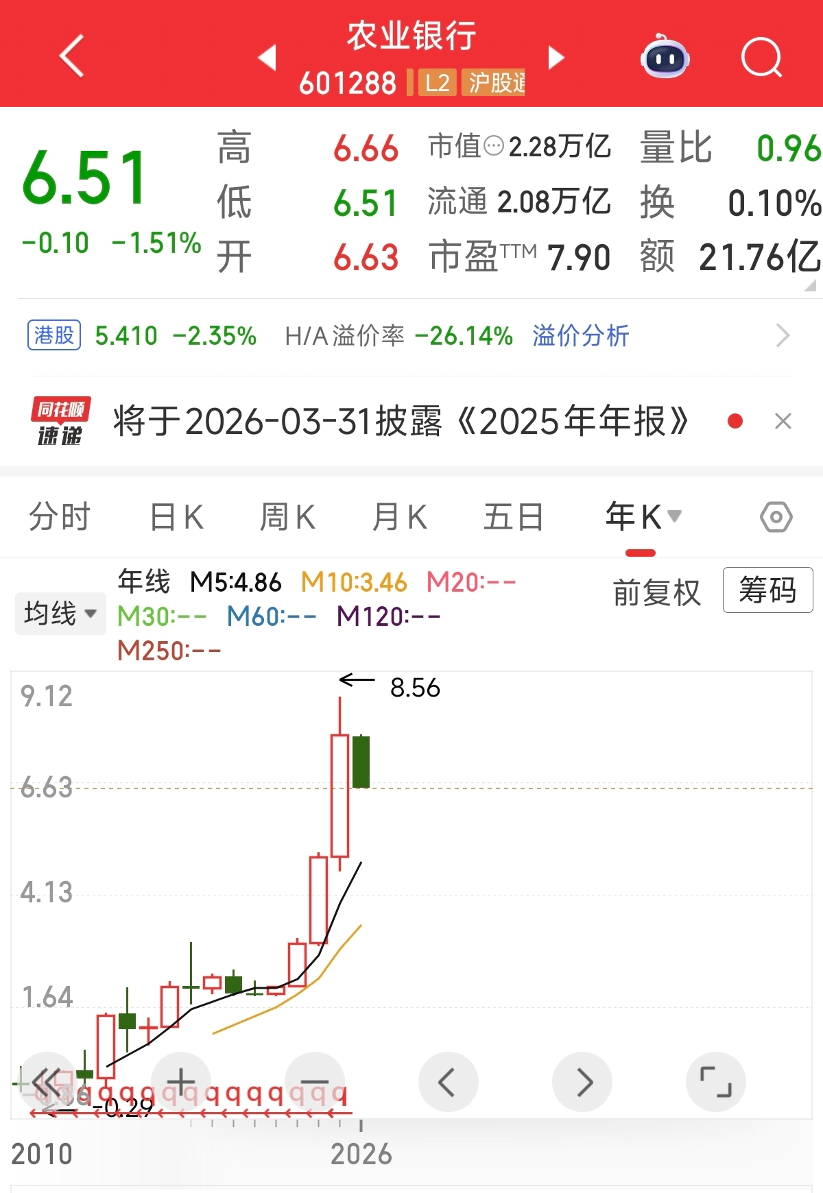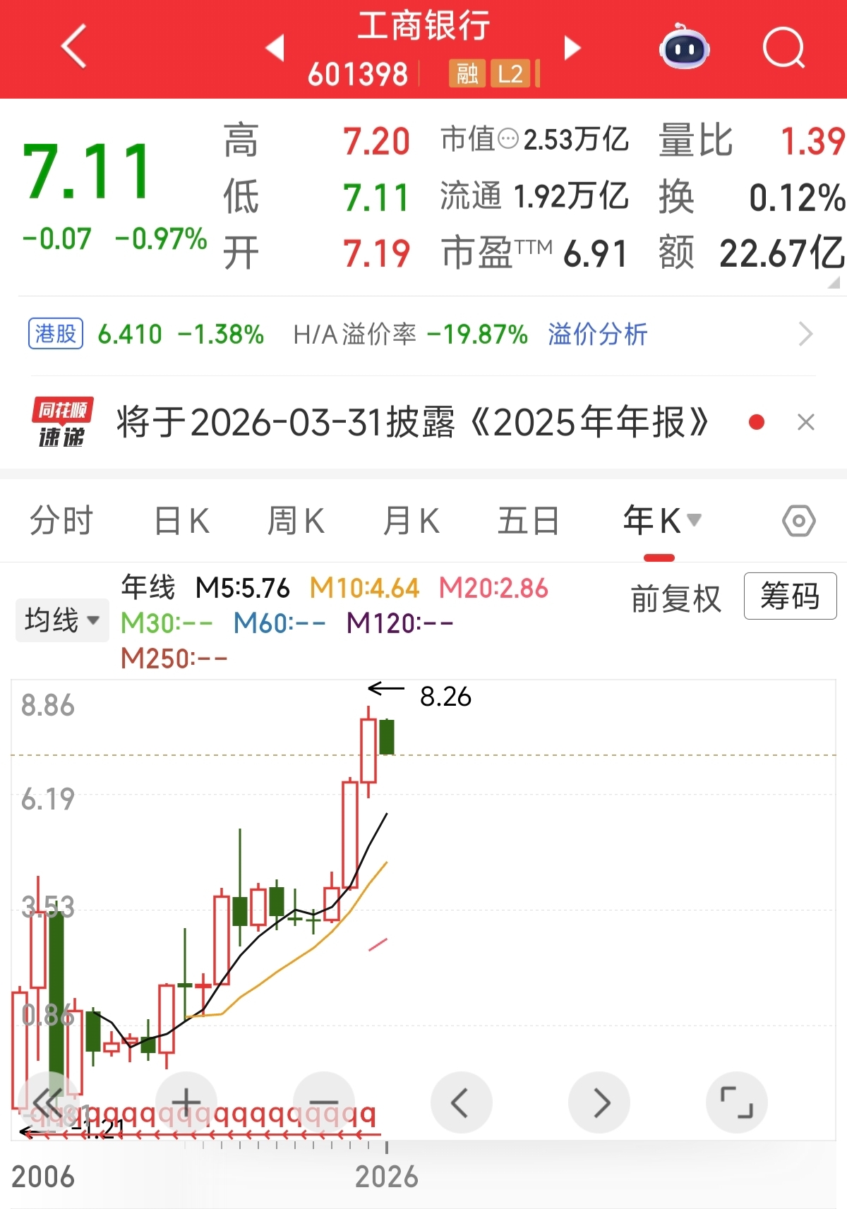 不过说来说去还是回归到卧龙的分水岭。 这是卧龙投资20年的精华,总结任何股票都要设定分水岭,那么目前对于工商银行来说,分水岭就设为7块钱,农业银行就设定为6块3毛钱。