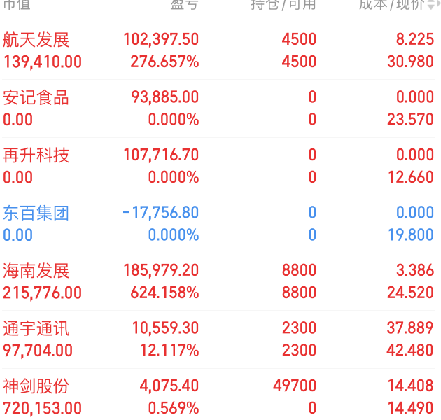航天发展:目前走的是第5浪,走势形态上有点类似于去年参与过的科技大牛常山北明。通常来说5浪的涨幅会比3浪小一些,这里预期不是太大了。而且连续两天大幅跳空上板对于100亿成交的大家伙来说,基本已经打满能量了。北哥可以确定的说,不会有3连板。所以,如果你是最近两个板才介入的,周二尽早走人吧,没必要再博了。如果像北哥和部分朋友下面横盘期间介入的,且苍位不大的,再格局一下也无妨,毕竟它是板块大龙头。$航天发展(SZ000547)$