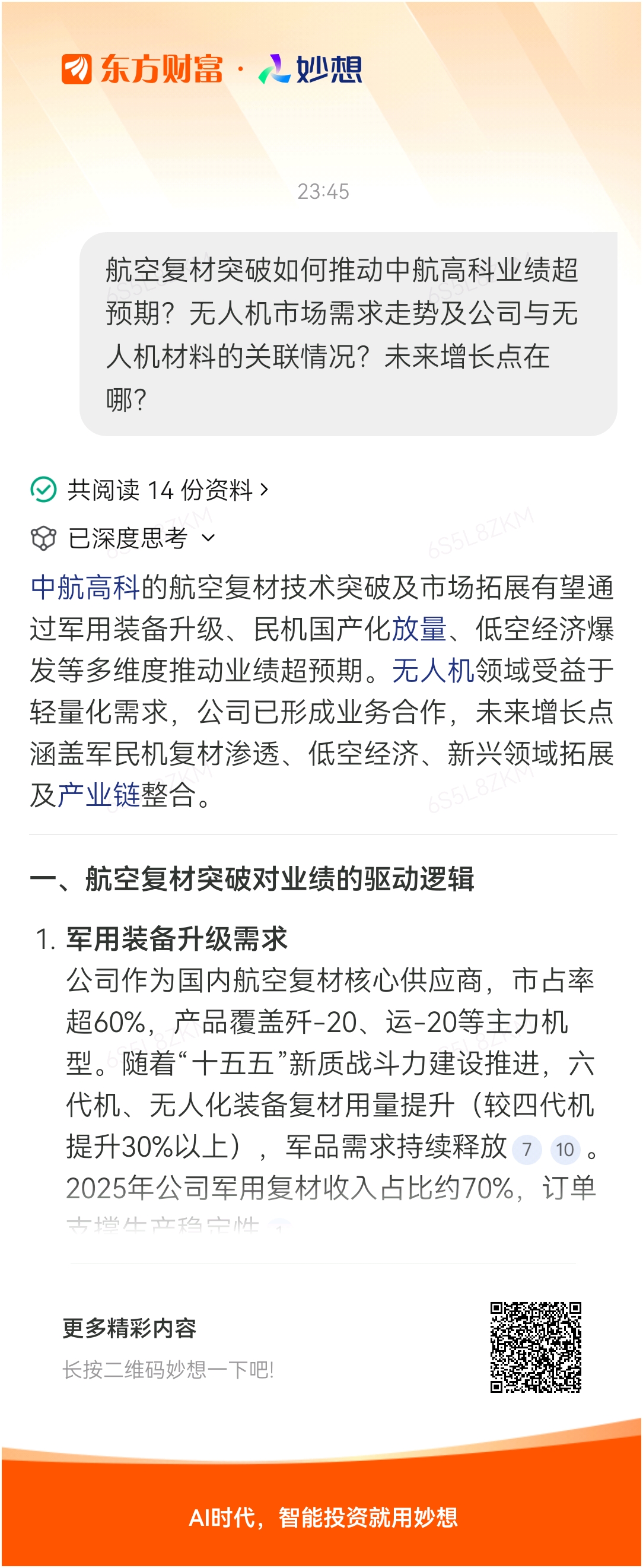 #@妙想,你怎么看?# 妙想一下:航空复材突破如何推动中航高科业绩超预期?无人机市场需求走势及公司与无人机材料的关联情况?未来增长点在哪?
