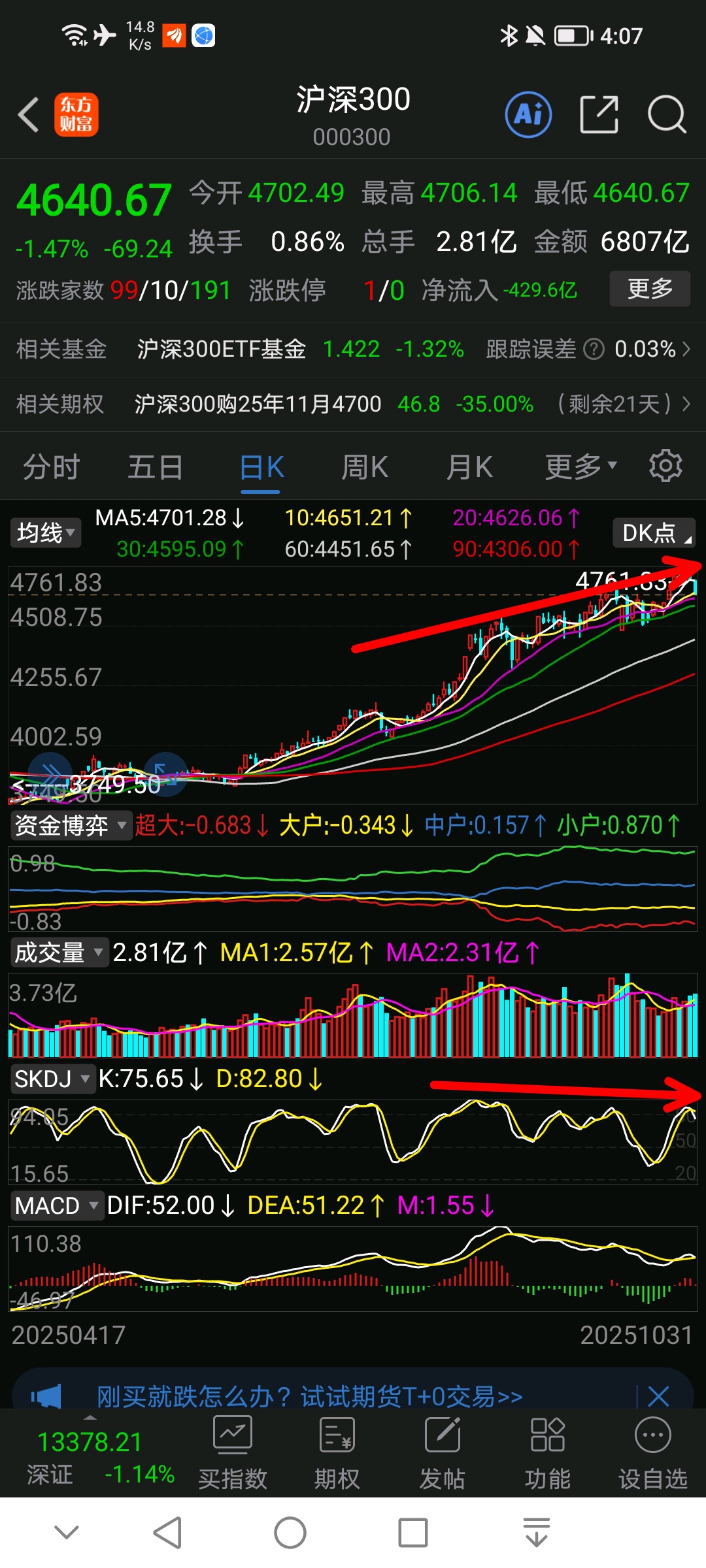 $沪深300(SH000300)$ 尽管上涨创了新高,但是我们发现上涨顶背离,也就是背离次数越多,以后容易下跌,至于什么时候跌?不知道,一般背离了两次容易下跌了,这是第二次背离的回调下跌了,