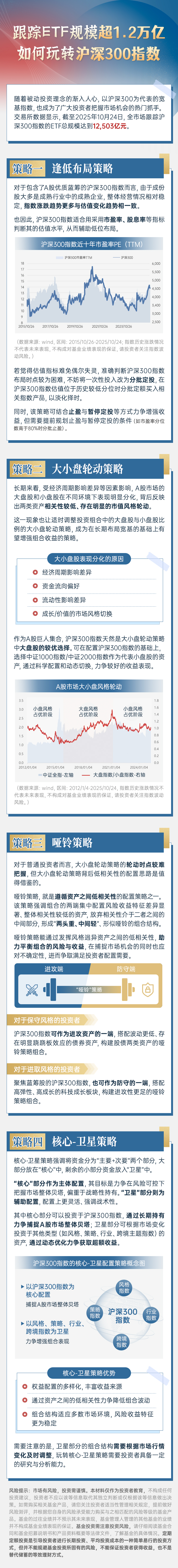 随着被动投资理念的渐入人心,以沪深300为代表的宽基指数,也成为了广大投资者把握市场机会的热门抓手,交易所数据显示,截至2025年10月24日,全市场跟踪沪深300指数的ETF总规模达到12503亿元。在此背景下,如何玩转沪深300指数?