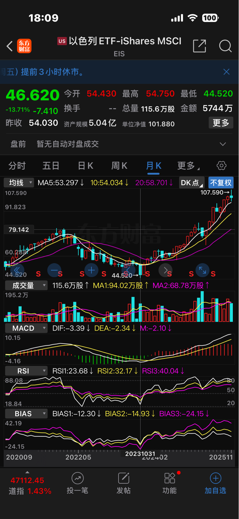2023年10月7日的冲突开始,伴随着以色列iShsre MSCi 跌到谷底46左右。但是随后从最低点反弹,两年多的冲突持续时间,以色列股票指数一直持续上涨,至目前其指数达到101,最高107,是冲突爆发时的2.3倍!