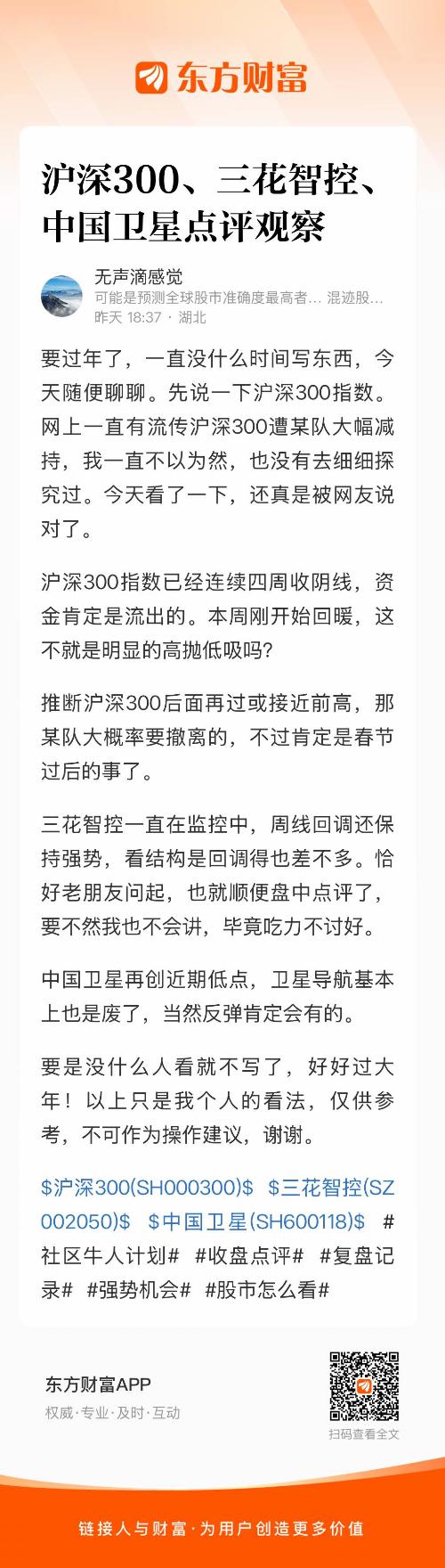 $沪深300(SH000300)$ $三花智控(SZ002050)$ $中国卫星(SH600118)$ #社区牛人计划# #收盘点评# #复盘记录# #强势机会# #股市怎么看#