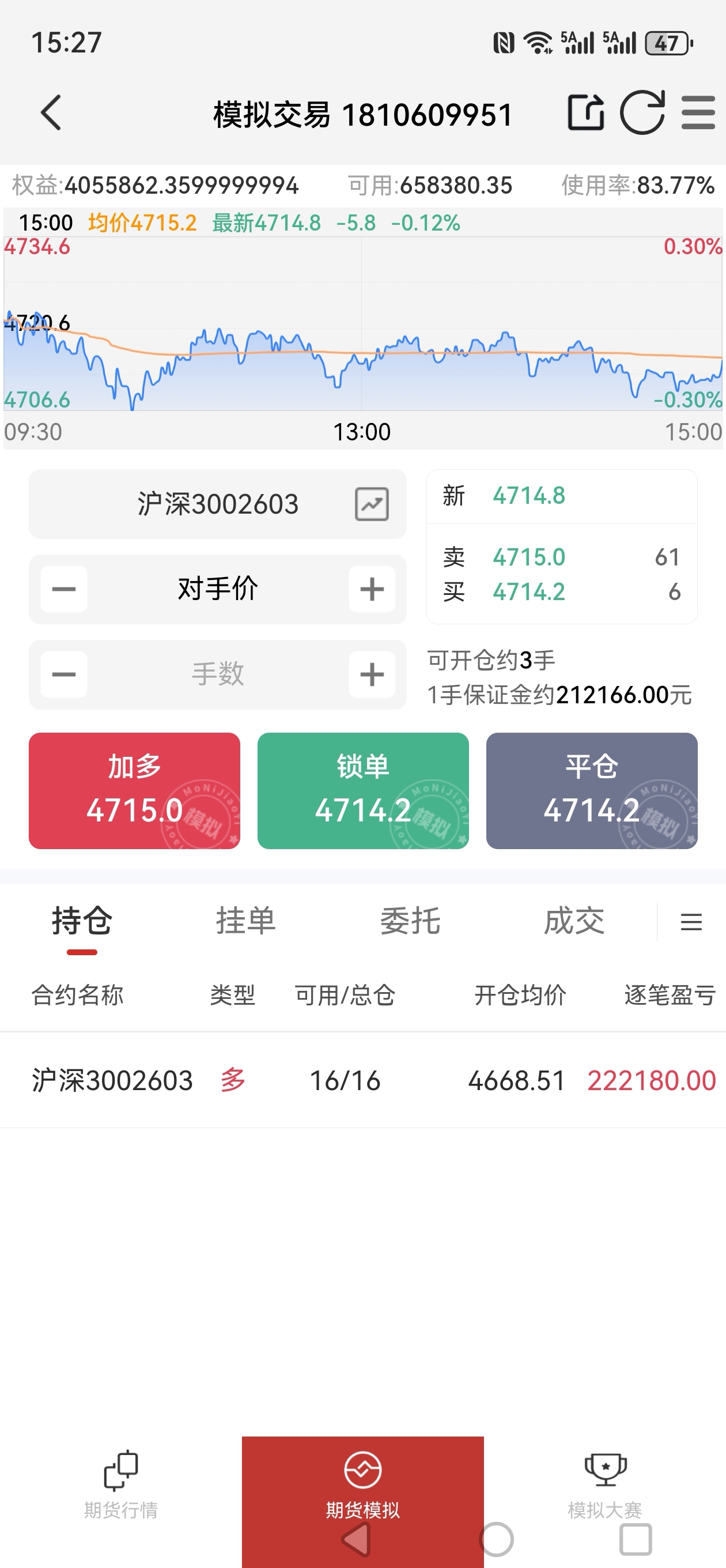 沪深三百期货模拟65-1000W今天比我预计的强了很多,所以空单平仓点位高了点,