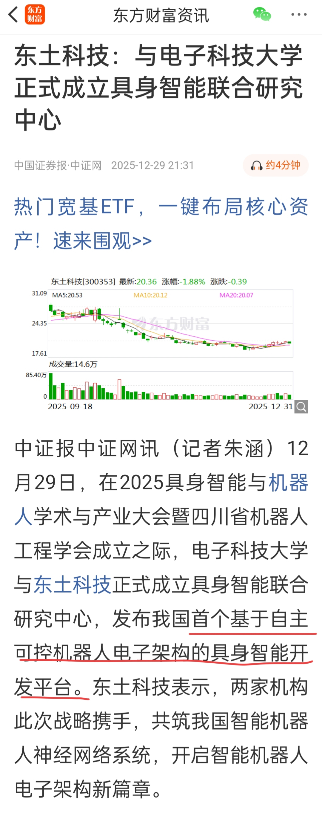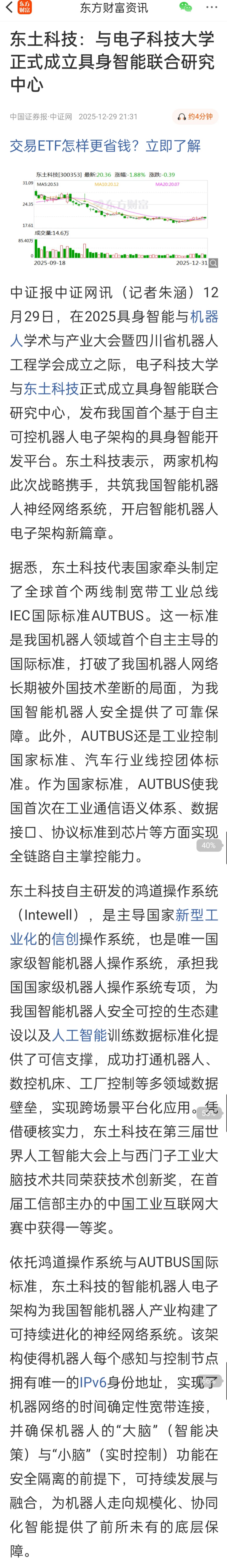 2025年12月29日,东土科技携手电子科技大学发布了我国首个基于自主可控机器人电子架构的“具身智能开发平台“(中国证券报用词)。这是一个底层技术完全透明的具身智能开发平台。首先,底层技术自主可控,体现在操作系统、总线、机器人电子架构均自主可控(自研并达到世界领先水平),芯片与海光信息、摩尔线程合作,算力芯片、AI芯片、SoC芯片自主可控(高性能保证)。其次,底层技术,世界一流。操作系统采用鸿道操作系统,是我国唯一的国家级智能机器人操作系统(中国证券报用词)。机器人总线采用AUTBUS总线,该总线已正式成为我国机器人网络国家标准(中国证券报用词),各项指标远超现行机器人总线CAN总线,且通信加密。机器人电子架构采用新一代大小脑融合电子架构,使电子架构成本降50%、功耗降60%、体积缩小、线束减少。最后,鸿道操作系统最安全(国内唯一通过四项功能安全认证的国产操作系统)、高确定性(已在航空、核电、军工等多种严苛环境下运行检验)。