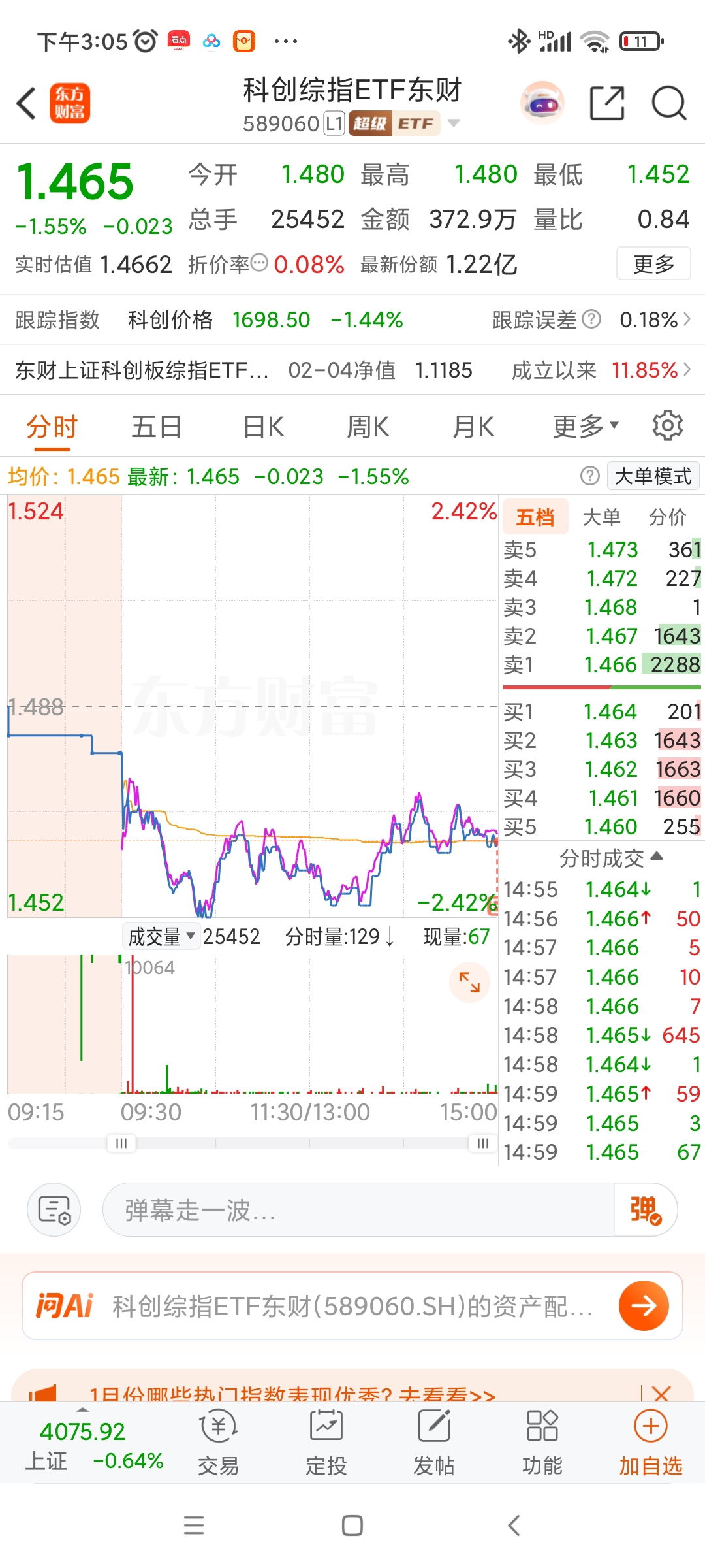 $科创综指(SH000680)$ 收盘价买了点科创板ETF,希望明天指数能给力点。