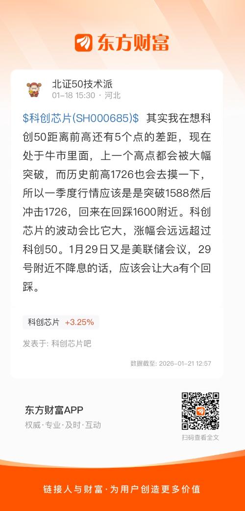 $科创芯片(SH000685)$ 其实我在想科创50距离前高还有5个点的差距,现在处于牛市里面,上一个高点都会被大幅突破,而历史前高1726也会去摸一下,所以一季度行情应该是是突破1588然后冲击1726,回来在回踩1600附近。科创芯片的波动会比它大,涨幅会远远超过科创50。1月29日又是美联储会议,29号附近不降息的话,应该会让大a有个回踩。