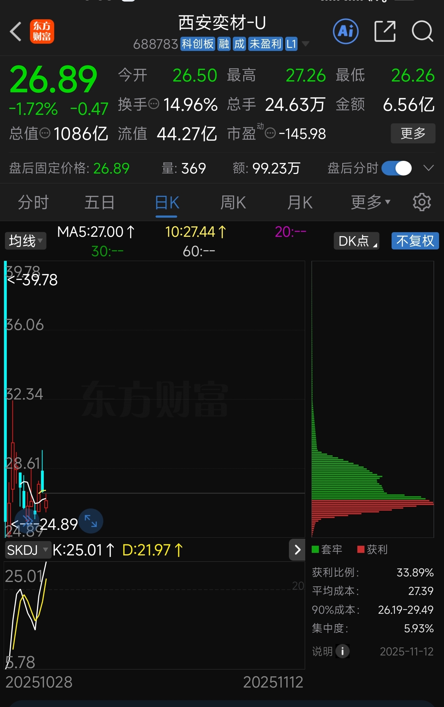 西安奕材的SKDJ指标(慢速随机指标)出现底背离,其核心含义为:标的价格持续下跌