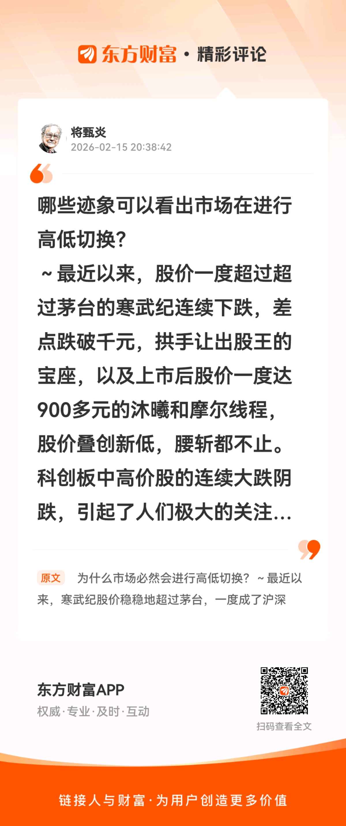 //@将甄炎 :哪些迹象可以看出市场在进行高低切换?~最近以来,股价一度超过超过茅台的寒武纪连续下跌,差点跌破千元,拱手让出股王的宝座,以及上市后股价一度达900多元的沐曦和摩尔线程,股价叠创新低,腰斩都不止。科创板中高价股的连续大跌阴跌,引起了人们极大的关注。与此同时,和寒武纪及摩尔同样是科创板股的和辉光电,因为其极度奇葩的低价,自然也如科创板最高价股寒武纪及摩尔一样受到密切关注。高岸为谷,深谷为陵,这是大自然的规律。股市中的高低切换也是同样的道理。看看最近一段时间机构对公司进行密集调研,再看看和辉光电发布的各种机构调研报告,以及经常出现的大宗交易,就明白了高低切换势在必然。同样的科创板股票,产品名列世界前列,国内第一,股价却是科创板绝无仅有的奇葩二元股!大牛市中,哪有资金不流向价值洼地的?寒武纪现在价位很难想象还能翻倍,而和辉光电现在价位翻倍不过5元多,是轻而易举的事。和辉半年报显示,经营现金流同比增长855.77%。今年扭亏为盈毫无悬念!和辉趋势股形态非常明朗,虽然目前还未有效站上去年10月8日的高点,但是启动迹象已经初露端倪,突破是毫无悬念的,后面的上涨空间极其巨大,无法估量!高低切换是势在必行!科创板叠创历史新高,和辉的5.14元高点还会远吗?