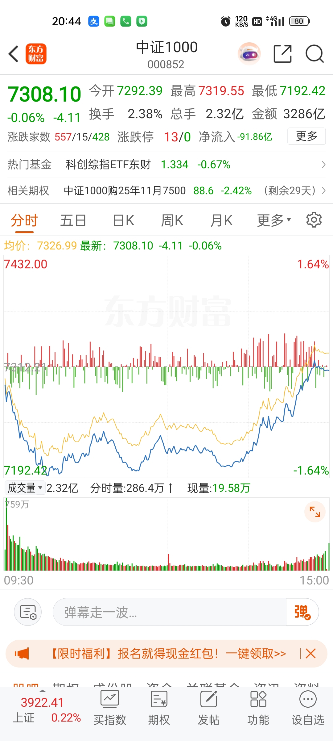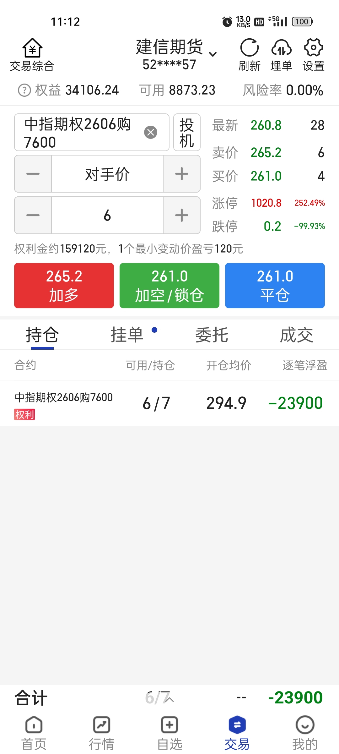 $中证1000(SH000852)$ 今天大深V,最近这波入场点位不算高,7张320开始进的,股指期权06C7600可惜成交不活跃,做T效果不好,成本降到290多了。但还是上午套住了,好在下午又起来了。只剩一个倔强,这轮牛市还