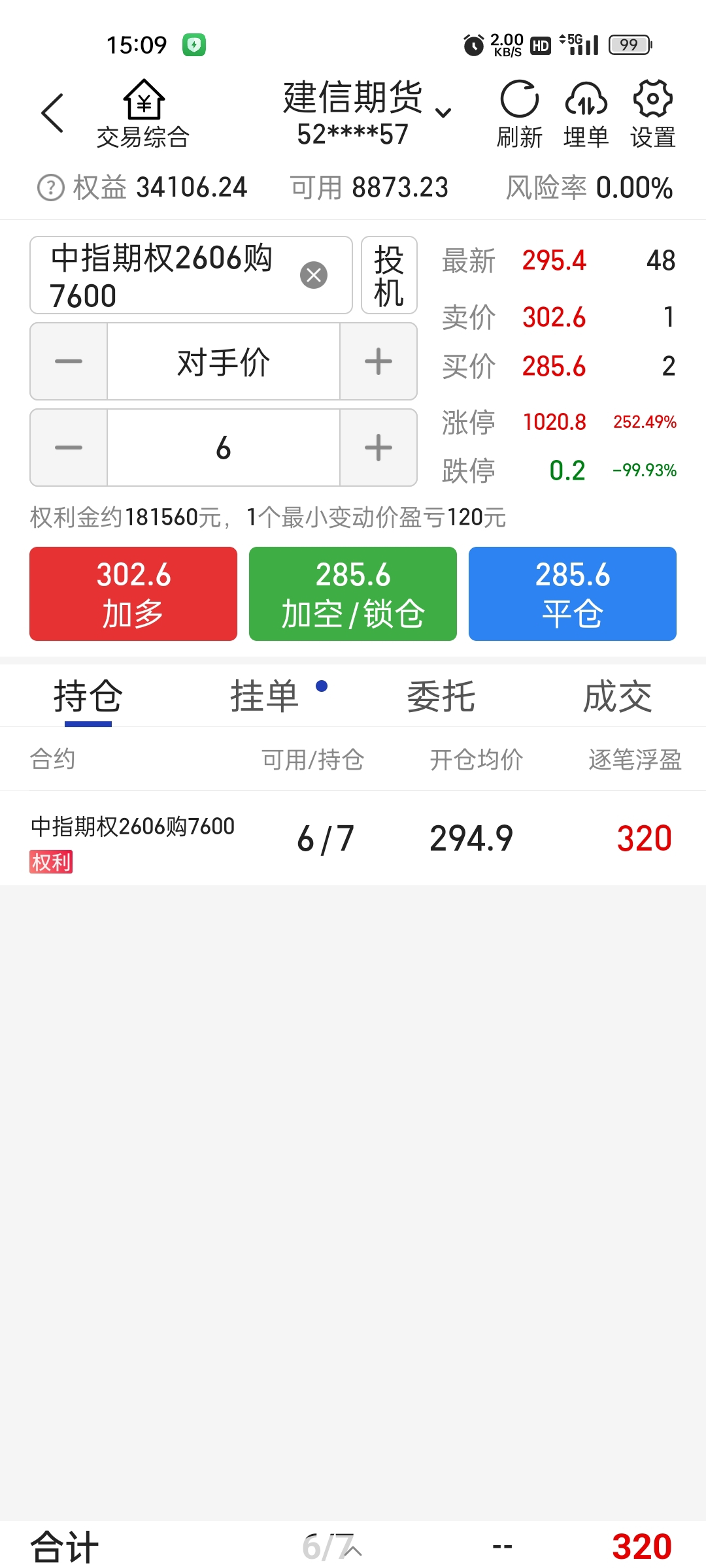 今天大深V,最近这波入场点位不算高,7张320开始进的,股指期权06C7600可