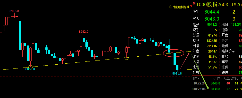 中证1000(im)2603合约,早上第一波 支撑位有效,第二波 支撑破,目前趋势线的支撑已经变成压力位,需要注意下。