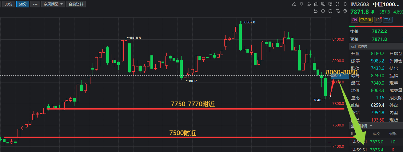 中证1000(im)2603合约,目前跌破强支撑位,后续看空,不过在做空之前,行情会有反弹,注意8060-8080附近,不破位就去做空,下方7750-7770附近的支撑位,和7500-7520附近的支撑位。