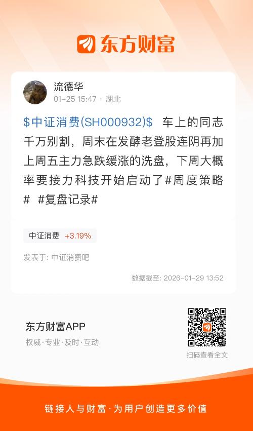 $中证消费(SH000932)$ 车上的同志千万别割,周末在发酵老登股连阴再加上周五主力急跌缓涨的洗盘,下周大概率要接力科技开始启动了#周度策略# #复盘记录#