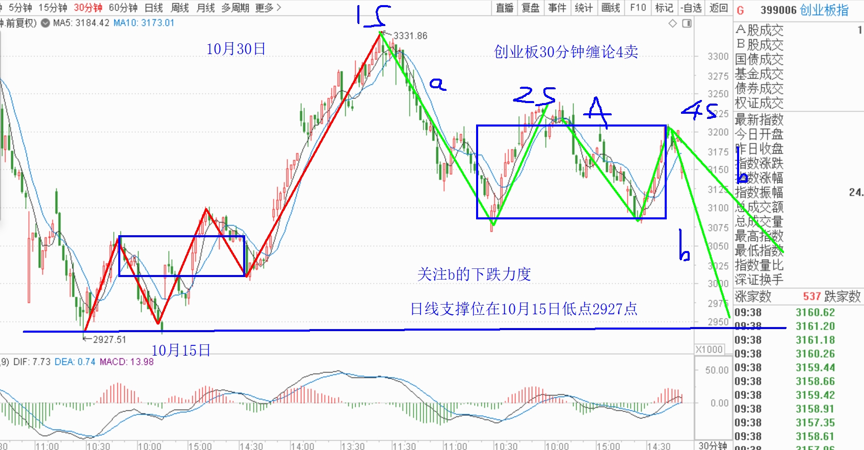 创业板30分钟10月30日以来是下跌结构a+A+b,今天早盘形成缠论4卖信号,关