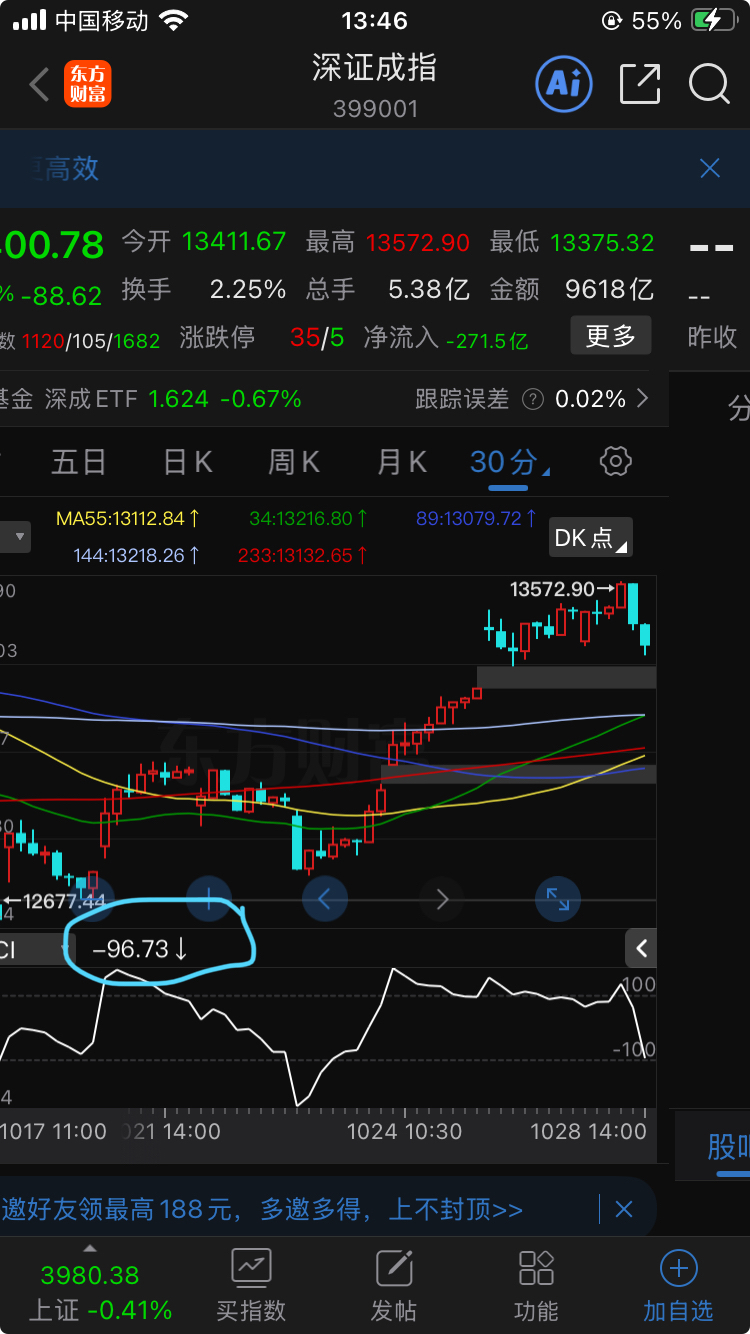 $深证成指(SZ399001)$ 30分钟级别离下方均线还较远(目前已跌破15分钟级别均线系统上沿的绿色均线)——买卖关系显示30分钟级别已处于绝对卖出区域