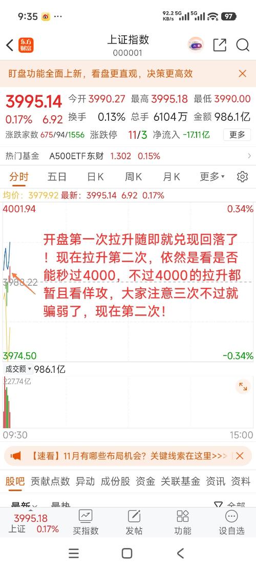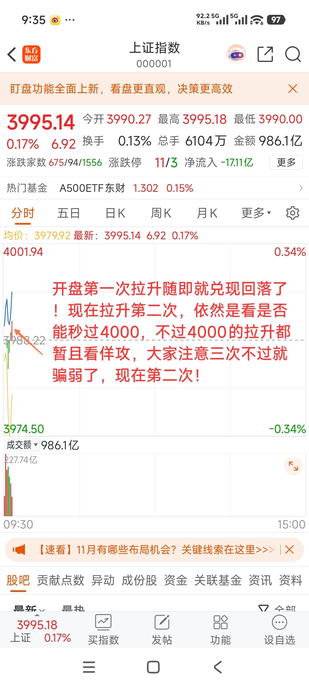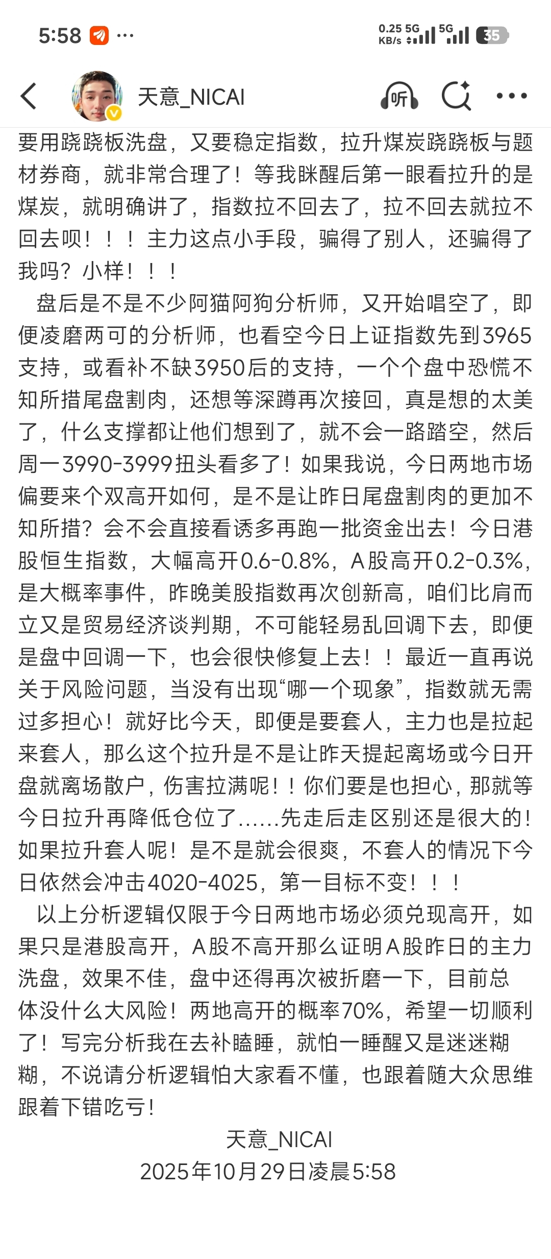 盘后是不是不少阿猫阿狗分析师,又开始唱空了,即便凌磨两可的分析师,也看空今日上证指数先到3965支持,或看补不缺3950后的支持,一个个盘中恐慌不知所措尾盘割肉,还想等深蹲再次接回,真是想的太美了,什么支撑都让他们想到了,就不会一路踏空,然后周一3990-3999扭头看多了!如果我说,今日两地市场偏要来个双高开如何,是不是让昨日尾盘割肉的更加不知所措?会不会直接看诱多再跑一批资金出去!今日港股恒生指数,大幅高开0.6-0.8%,A股高开0.2-0.3%,是大概率事件,昨晚美股指数再次创新高,咱们比肩而立又是贸易经济谈判期,不可能轻易乱回调下去,即便是盘中回调一下,也会很快修复上去!!最近一直再说关于风险问题,当没有出现“哪一个现象”,指数就无需过多担心!就好比今天,即便是要套人,主力也是拉起来套人,那么这个拉升是不是让昨天提起离场或今日开盘就离场散户,伤害拉满呢!!你们要是也担心,那就等今日拉升再降低仓位了……先走后走区别还是很大的!如果拉升套人呢!是不是就会很爽,不套人的情况下今日依然会冲击4020-4025,第一目标不变!!!