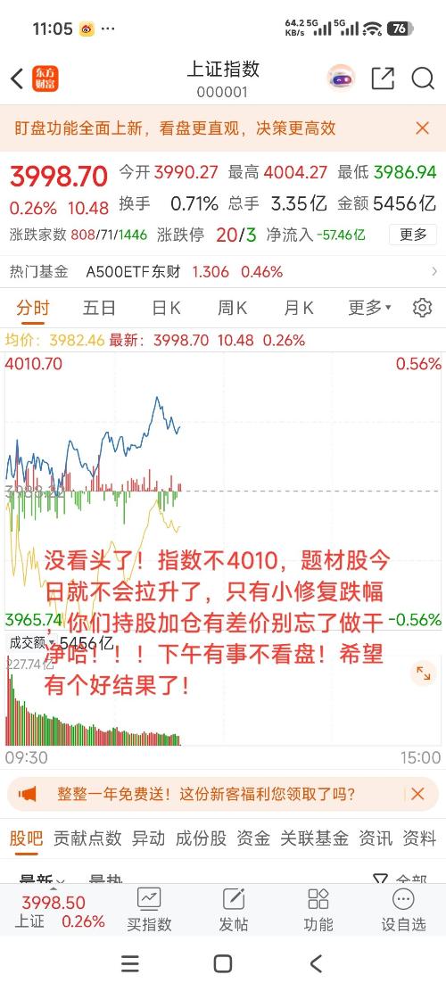 没看头了!指数不4010,题材股今日就不会拉升了,只有小修复跌幅,你们持股加仓有差价别忘了做干净哈!!!下午有事不看盘!希望有个好结果了! //@天意_NICAI :来!今日是不是看券商发威拉升指数闯4000点!花里胡哨,加油继续冲冲冲,目前不少个股主力还没反应过来,不知道发生了什么,还不跟跟随券商直接拉升!不过,过了4010都就反应过来了!