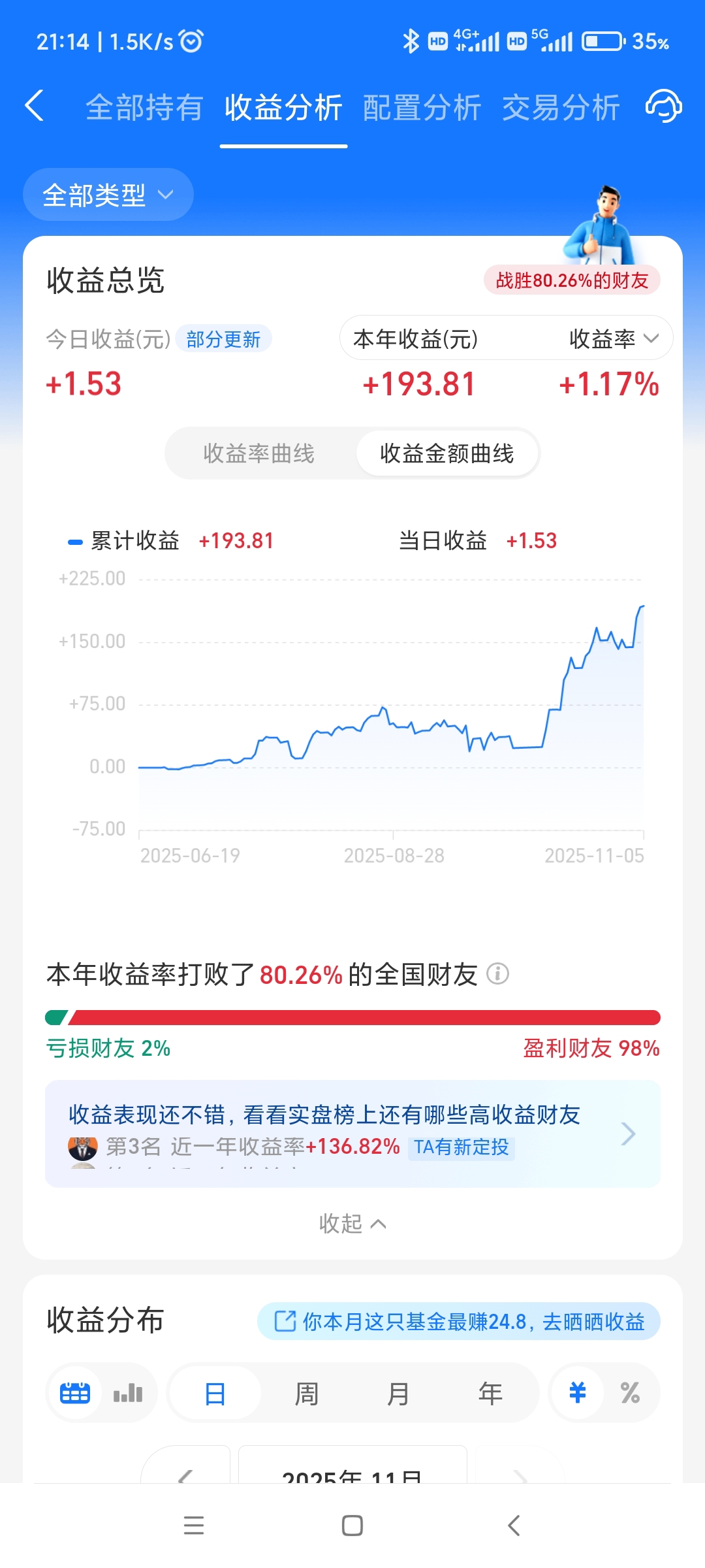 理财第69天,今天赚了+1.53元,累计盈利+193.81元,再度突破个人新高。