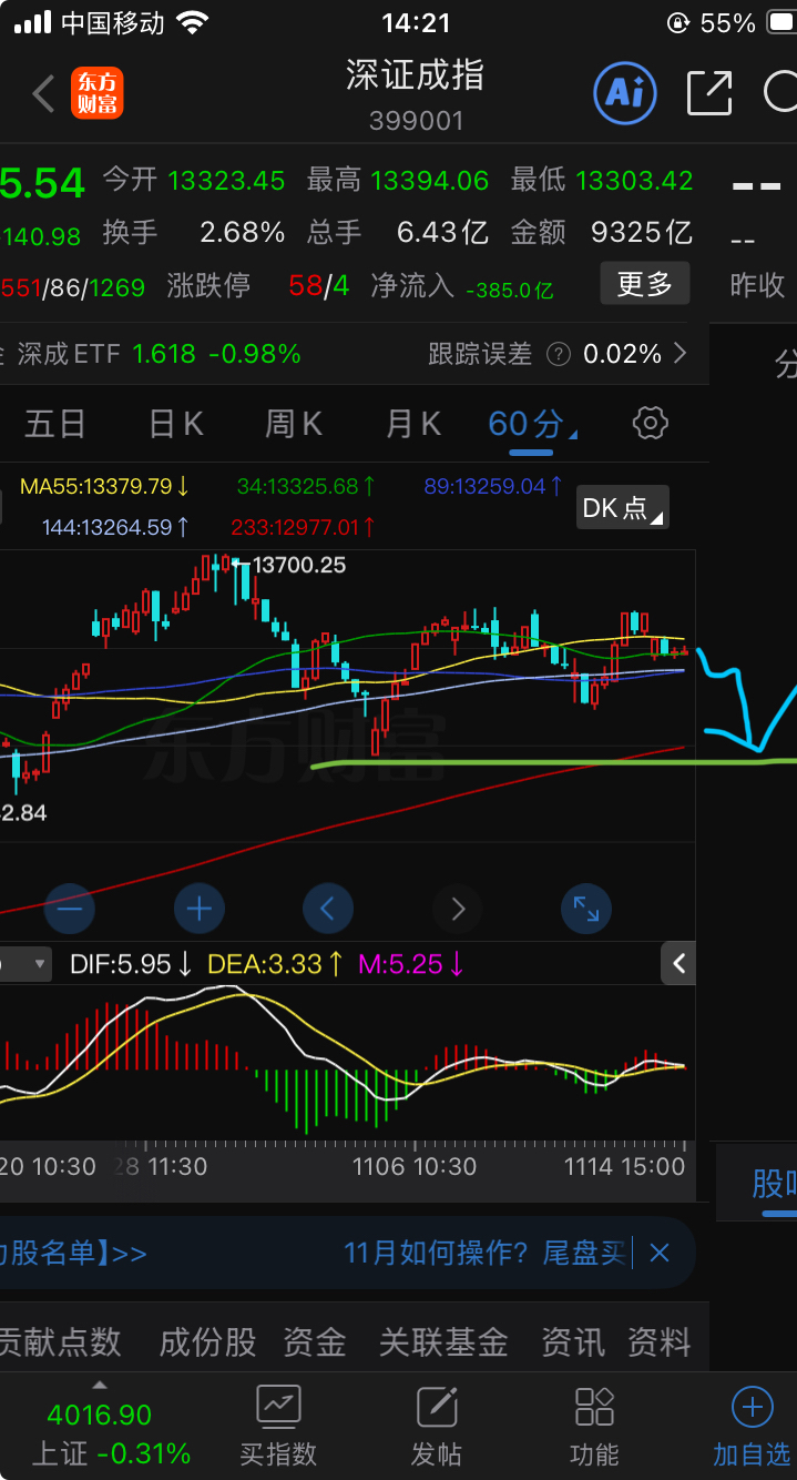 $深证成指(SZ399001)$ 放弃抵抗吧,散户——60分钟级别既然涨不动(其实左侧已经是双头小b台阶型下跌中继),那就将要转入下跌波段了