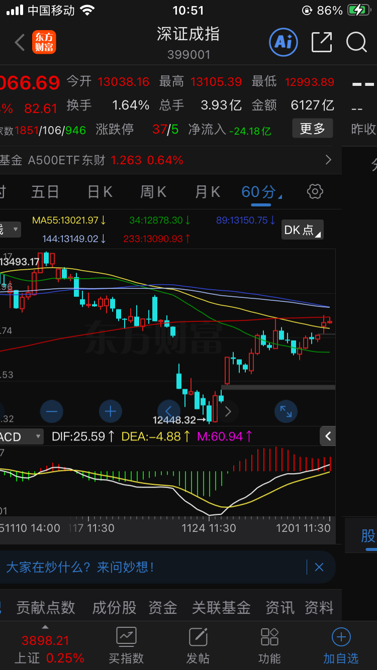 $深证成指(SZ399001)$ 这波反弹能否放大,就看60分钟级别——能否突破横置的红色均线。更小的30分钟级别对应突破该级别最上方两条蓝色系均线交汇点,从而转入强势区间