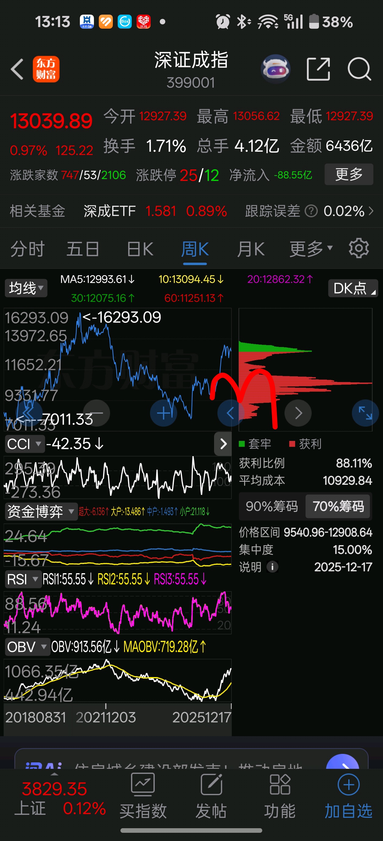 $深证成指(SZ399001)$ 深指周线三重顶,主力成本10000