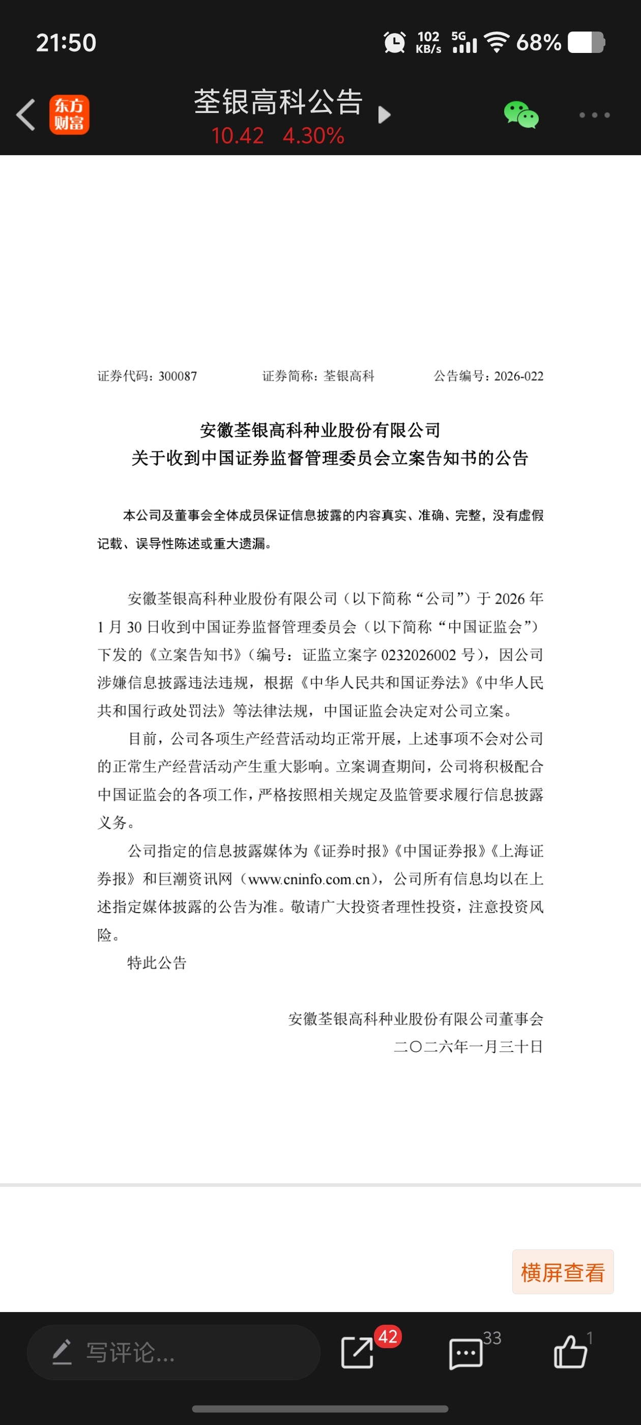 $荃银高科(SZ300087)$ 荃银 今天被立案调查,立案原因。涉嫌信息披露违规违法。