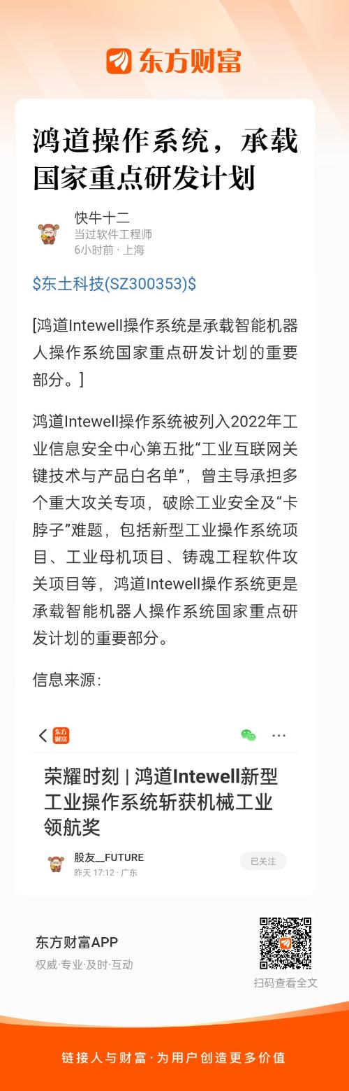 $创业板指(SZ399006)$美国智库认为,美国今年应安排500亿美元优先投资机器人操作系统。而中国,国家早已安排重点研发计划,东土科技鸿道操作系统,圆满实现了这一计划,这就是鸿道具身智能机器人操作系统(今年5月29日国家正式发布)