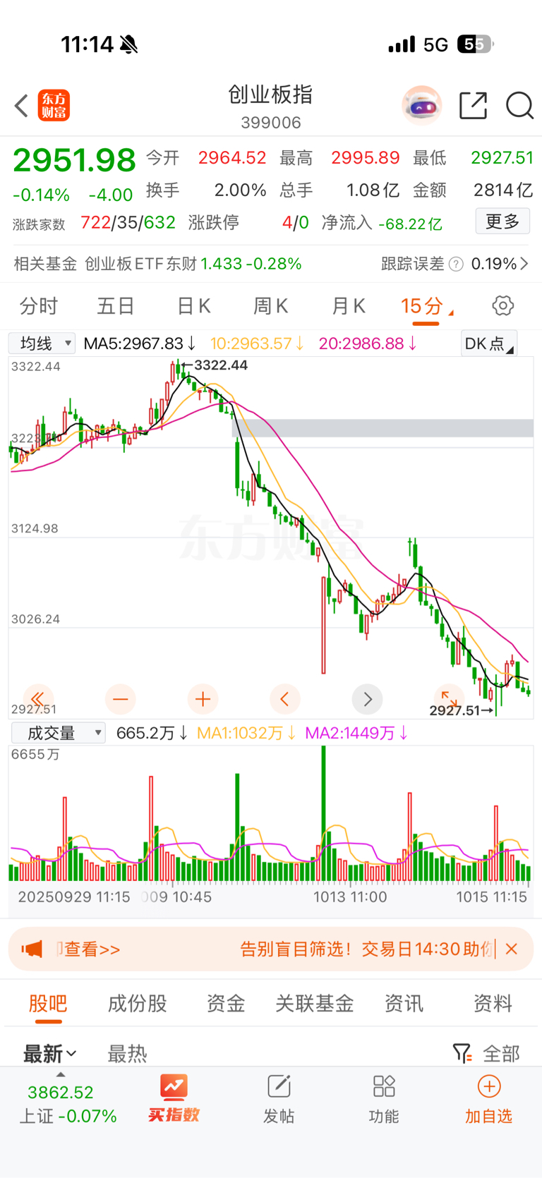 $创业板指(SZ399006)$ 15分钟走势,嘿嘿,还好节后仓位只有一成!太吓人了