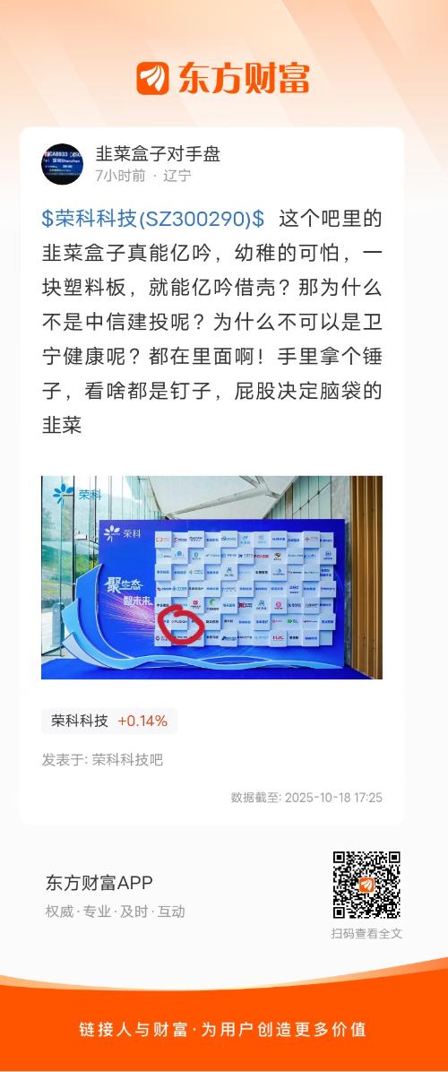 $荣科科技(SZ300290)$ 这个吧里的韭菜盒子真能亿吟,幼稚的可怕,一块塑料板,就能亿吟借壳?那为什么不是中信建投呢?为什么不可以是卫宁健康呢?都在里面啊!手里拿个锤子,看啥都是钉子,屁股决定脑袋的韭菜