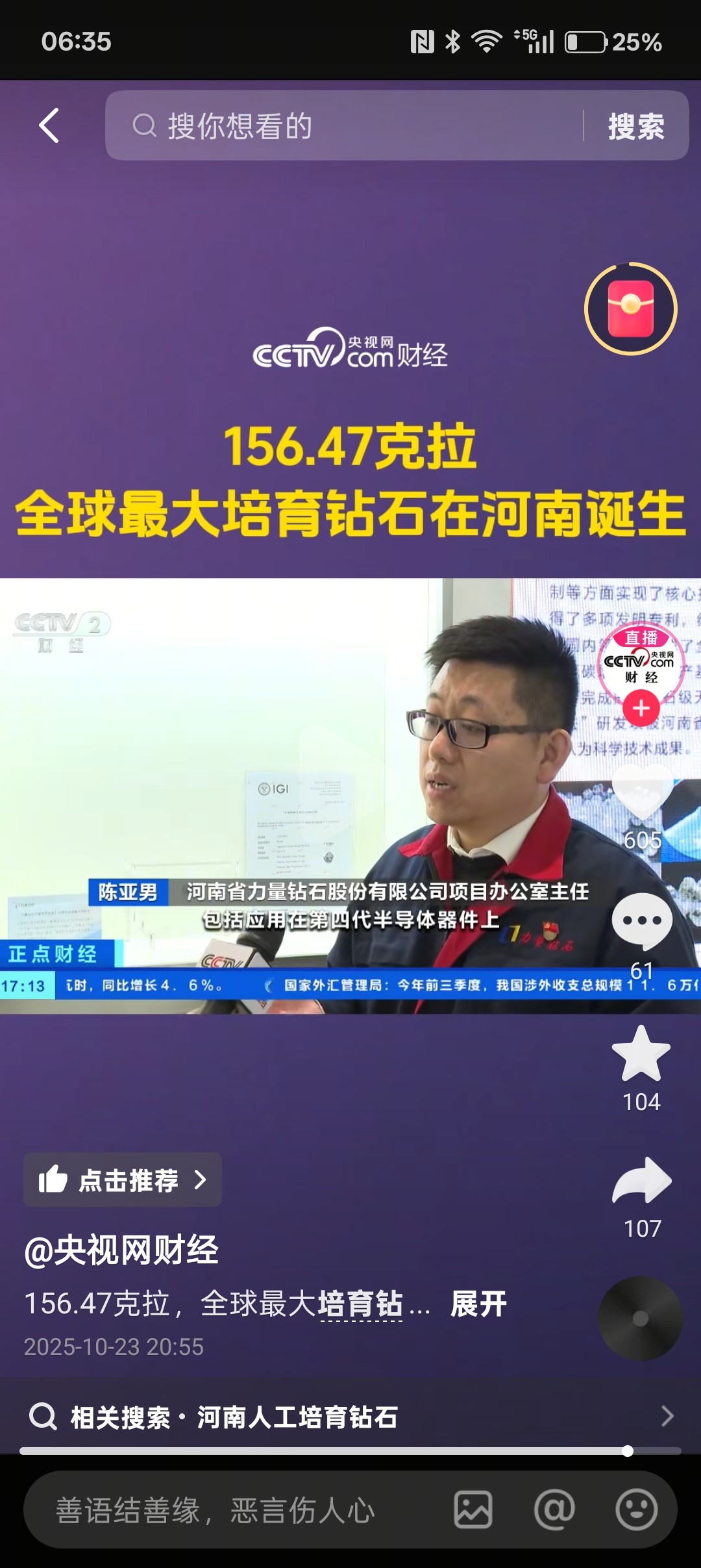 【河南造出全球最大培育钻石】河南商丘柘城县一家企业近日培育出一颗156.47克拉的钻石原石,该钻石为全球已知最大人工培育钻石单晶,刷新了之前150.42克拉的世界纪录。(央视财经)