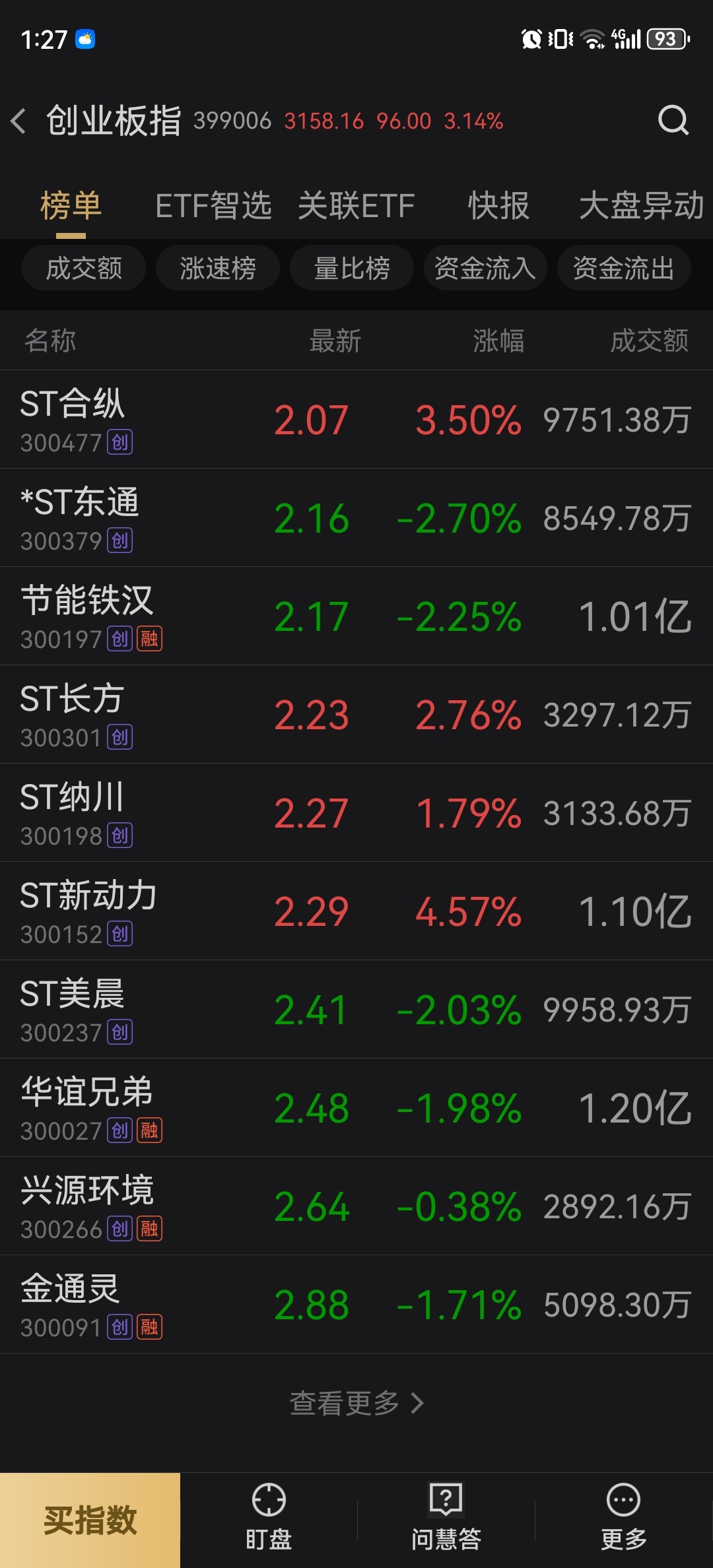 这个CD的股市!弱小者已无翻身之日!ST涨到那叫一个欢!非ST跌的那叫一个痛!指数已经要上天了!这就是特色!$华谊兄弟(SZ300027)$ $节能铁汉(SZ300197)$ $兴源环境(SZ300266)$
