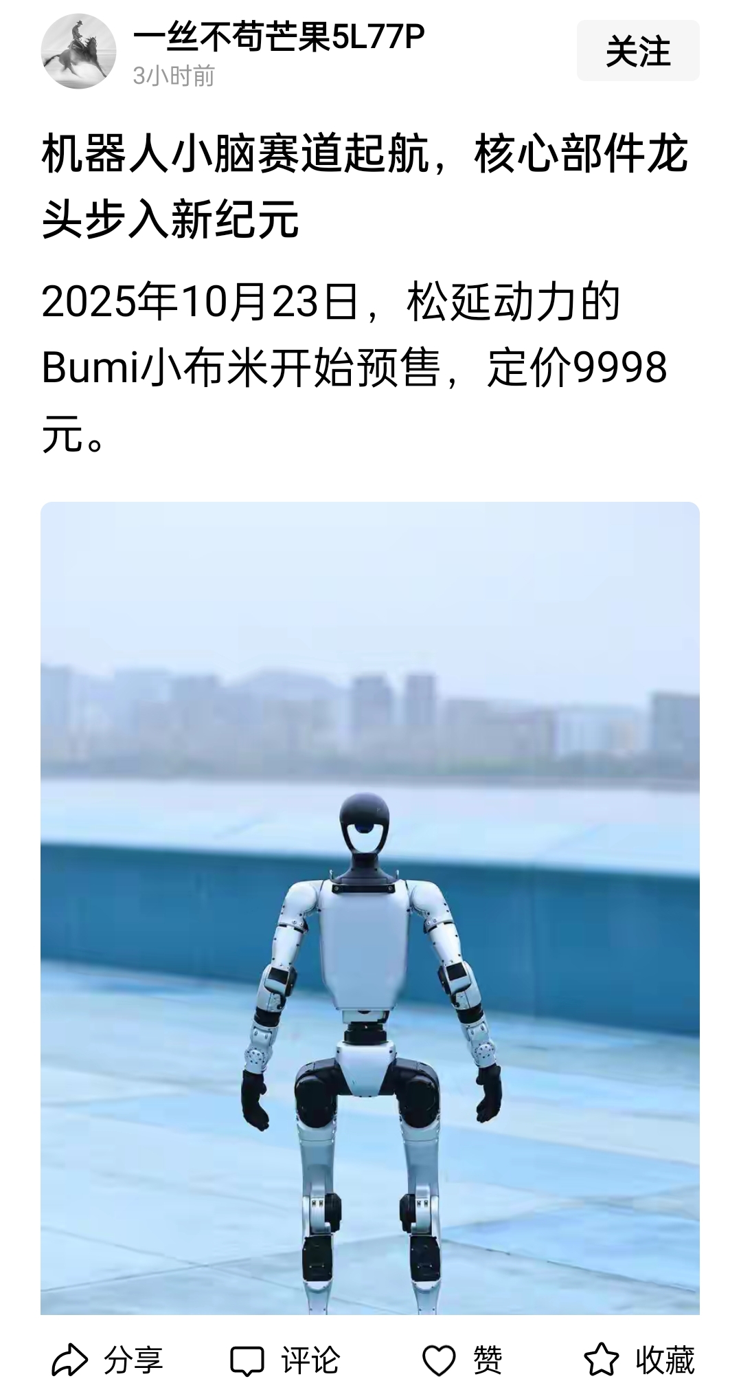 2025年10月23日,松延动力的Bumi小布米开始预售,定价9998元。