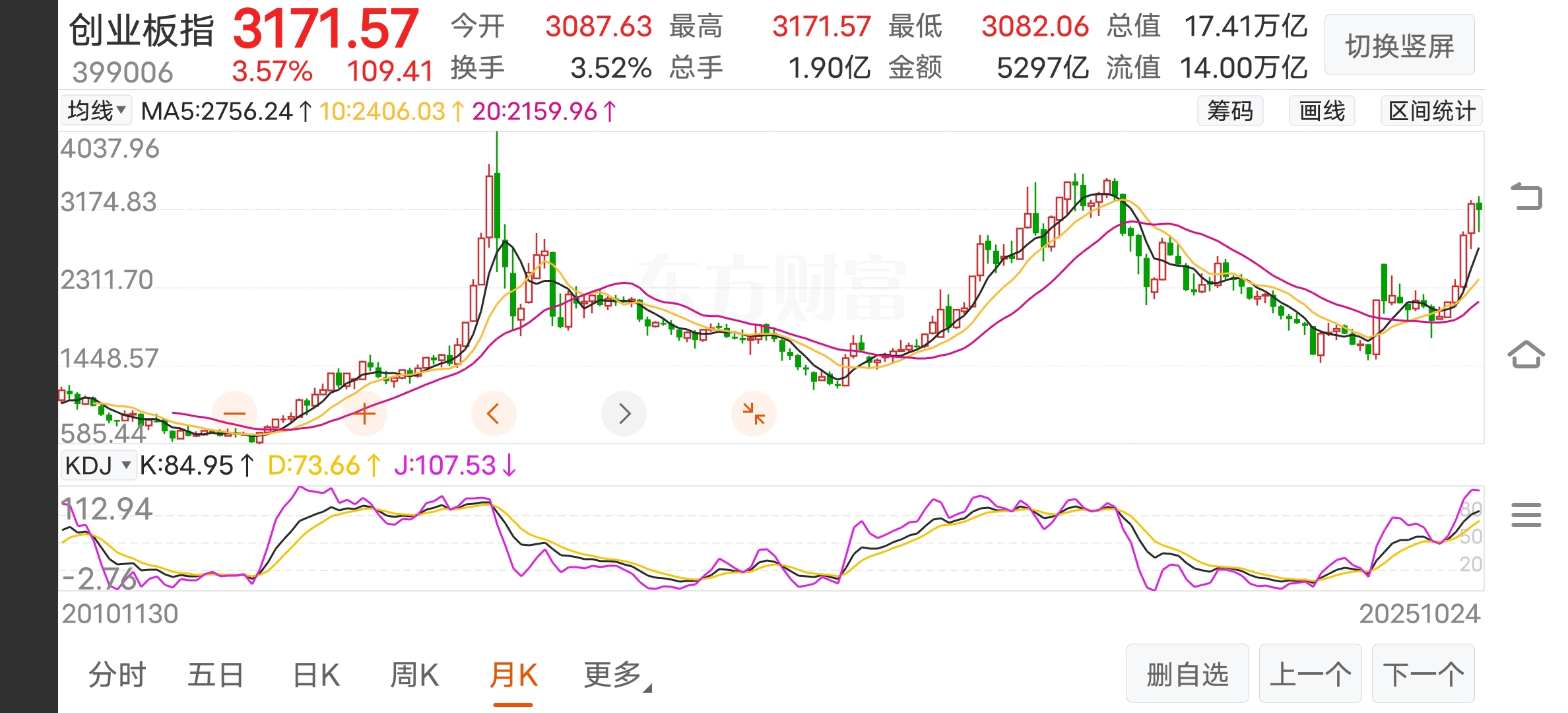 $创业板指(SZ399006)$ 从历史走势看 创业板 月线kDJ80以上 都是阶段顶点 要回调