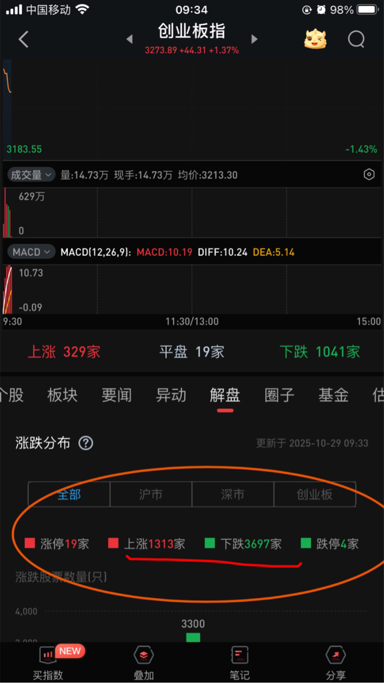 $创业板指(SZ399006)$ 疯g行情!光涨指数不涨股。光红指数,你见过大盘猛破新高!狂涨几只大盘股,动不动就跌近4000只,跌80%的股的行情?外人一看,啊!天天涨大盘,牛市阿!那知道!中间全是下跌的中小盘股,看来指数上我说的3500没多大悬念!只能等大盘股先上一波,中小盘再喝点汤。