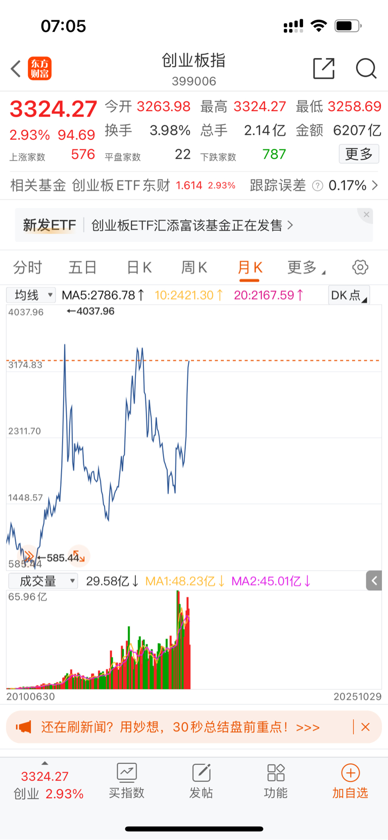我去,创业板年线收盘价已经新高了,月线今天再涨一天也要新高了,太牛了吧