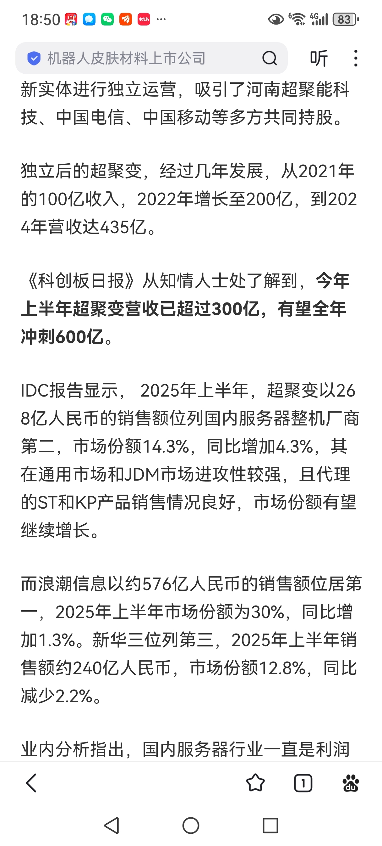 IDC报告显示, 2025年上半年,超聚变以268亿人民币的销售额位列国内服务器整机厂商第二,市场份额14.3%,同比增加4.3%,其在通用市场和JDM市场进攻性较强,且代理的ST和KP产品销售情况良好,市场份额有望继续增长。