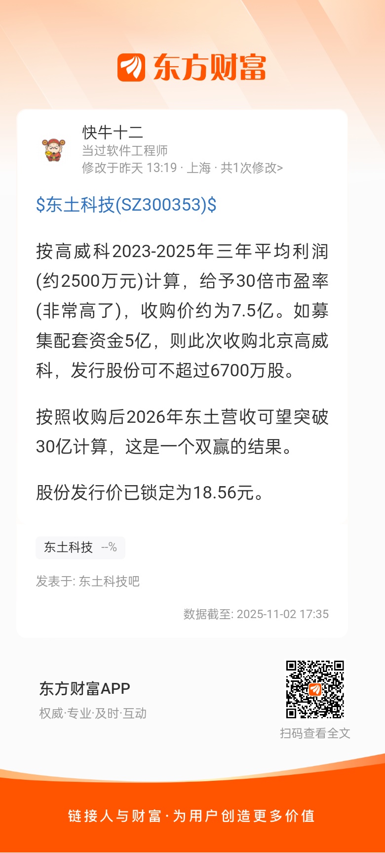 按高威科2023-2025年三年平均利润(约2500万元)计算,给予30倍市盈率(非常高了),收购价约为7.5亿。如募集配套资金5亿,则此次收购北京高威科,发行股份可不超过6700万股。