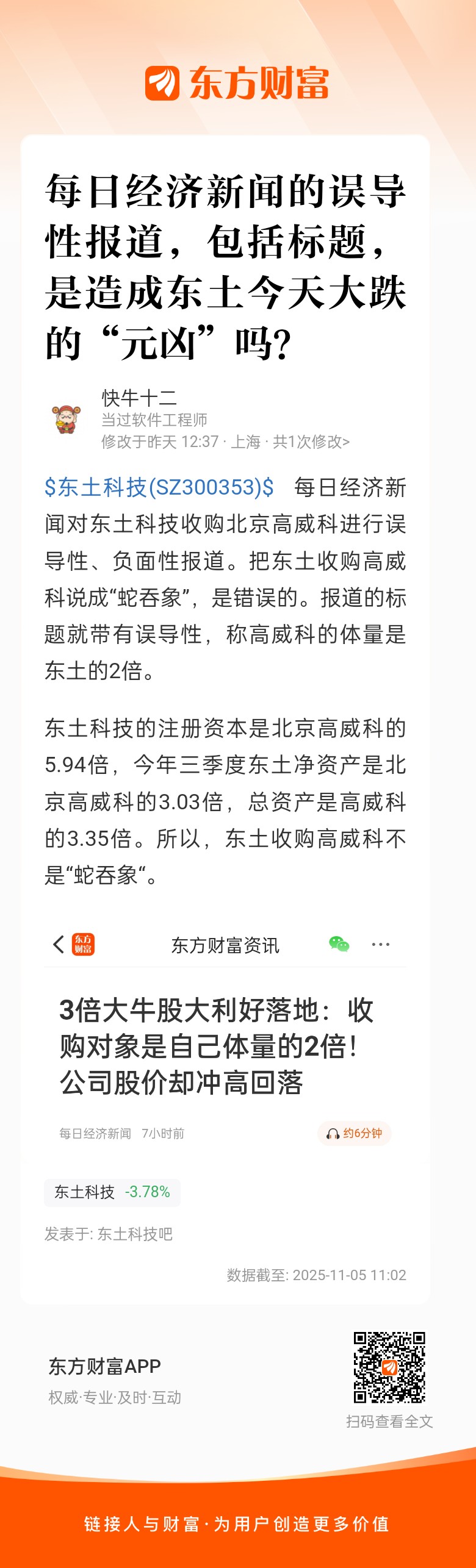$东土科技(SZ300353)$ 每日经济新闻对东土科技收购北京高威科进行误导性、负面性报道。把东土收购高威科说成“蛇吞象”,是错误的。报道的标题就带有误导性,称高威科的体量是东土的2倍。