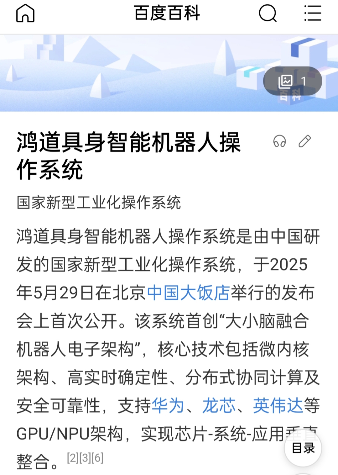 鸿道具身智能机器人操作系统,是由中国研发的[国家组织研发的]国家新型工业化操作系统,于2025年5月29日在北京中国大饭店举行的发布会上首次公开。该系统首创“大小脑融合机器人电子架构”,核心技术包括微内核架构、高实时确定性、分布式协同计算及安全可靠性,支持[海光]、华为、龙芯、英伟达等GPU/NPU架构,实现芯片-系统-应用垂直整合。