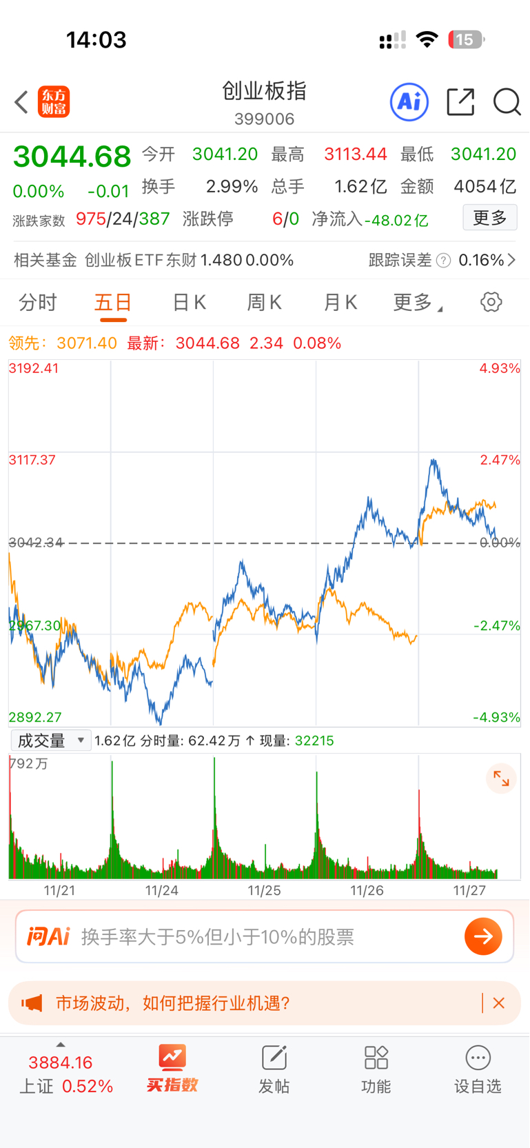 $创业板指(SZ399006)$ 每天都要冲高回落?