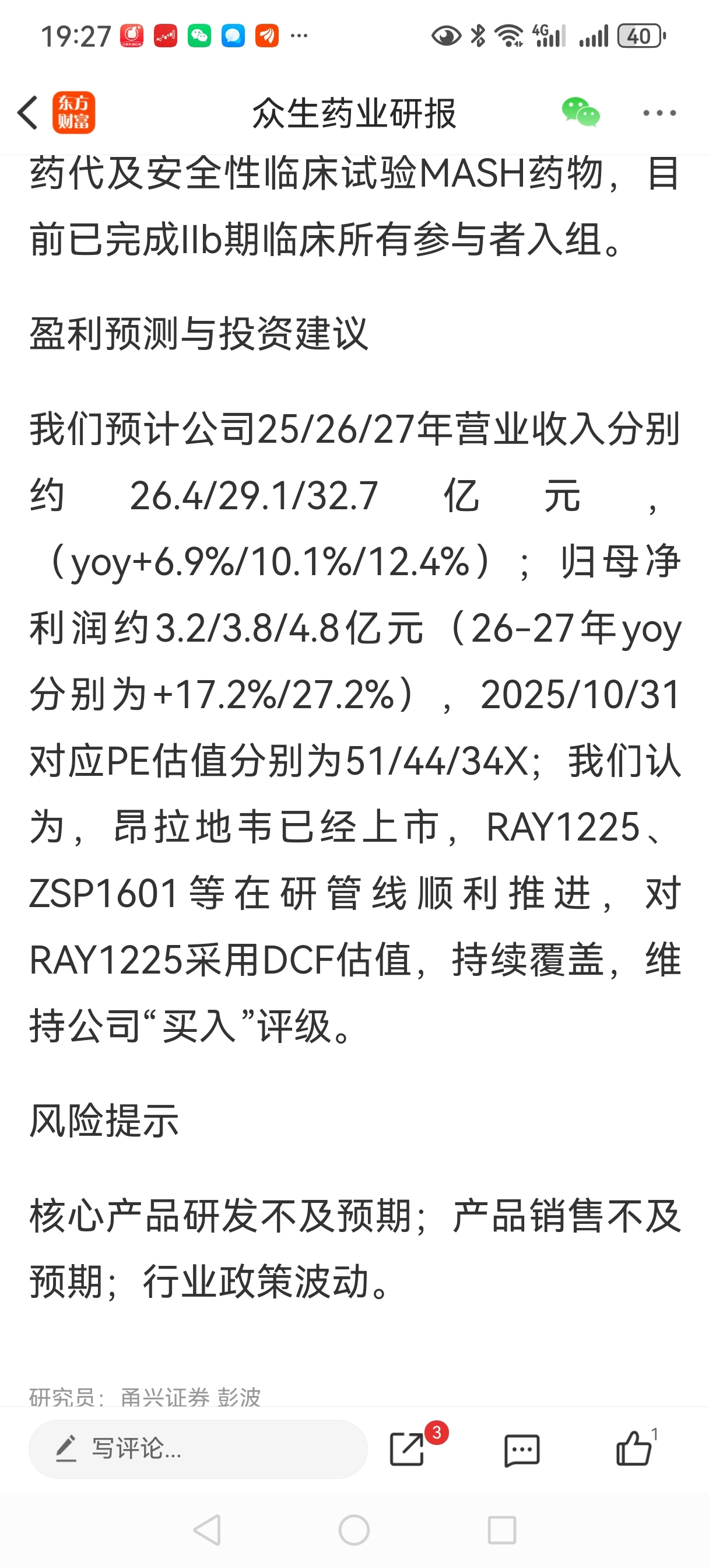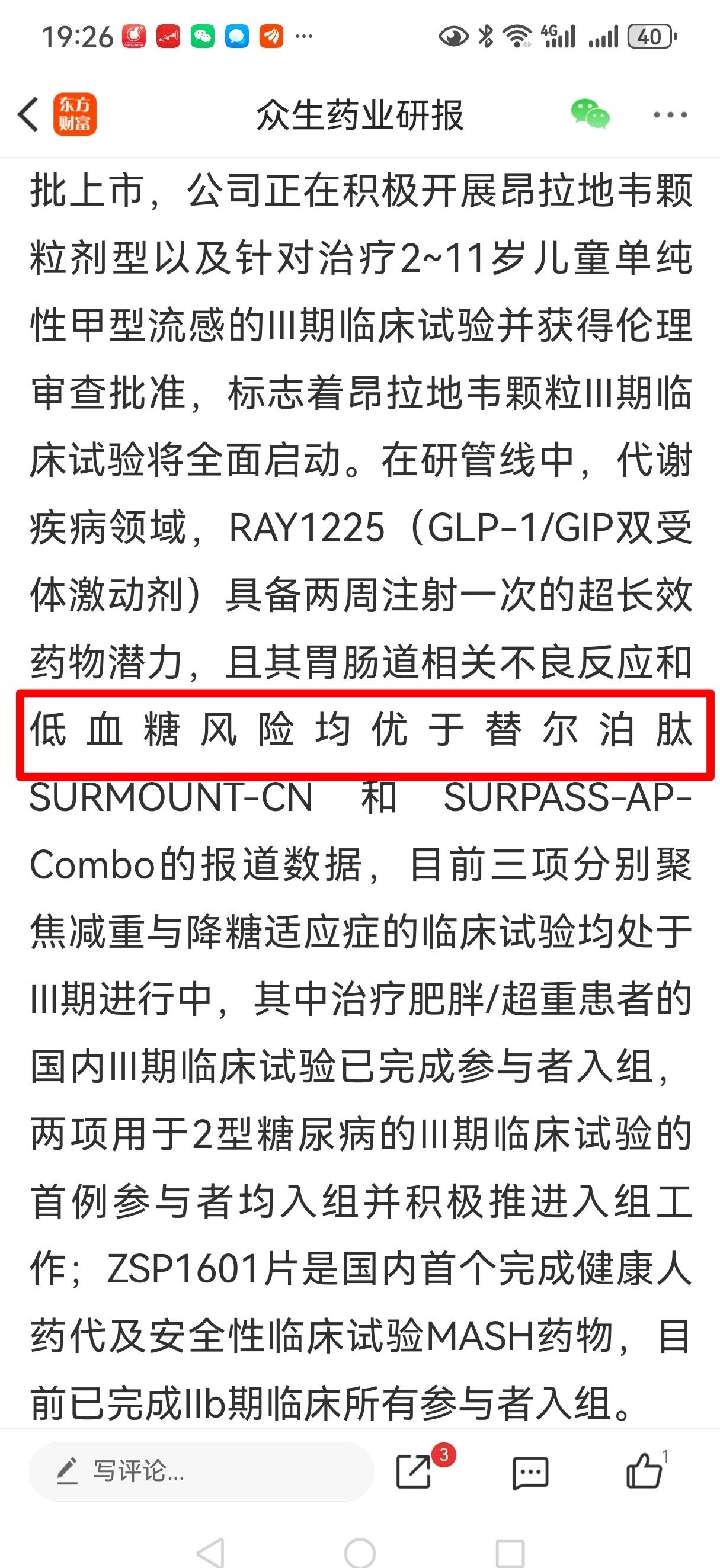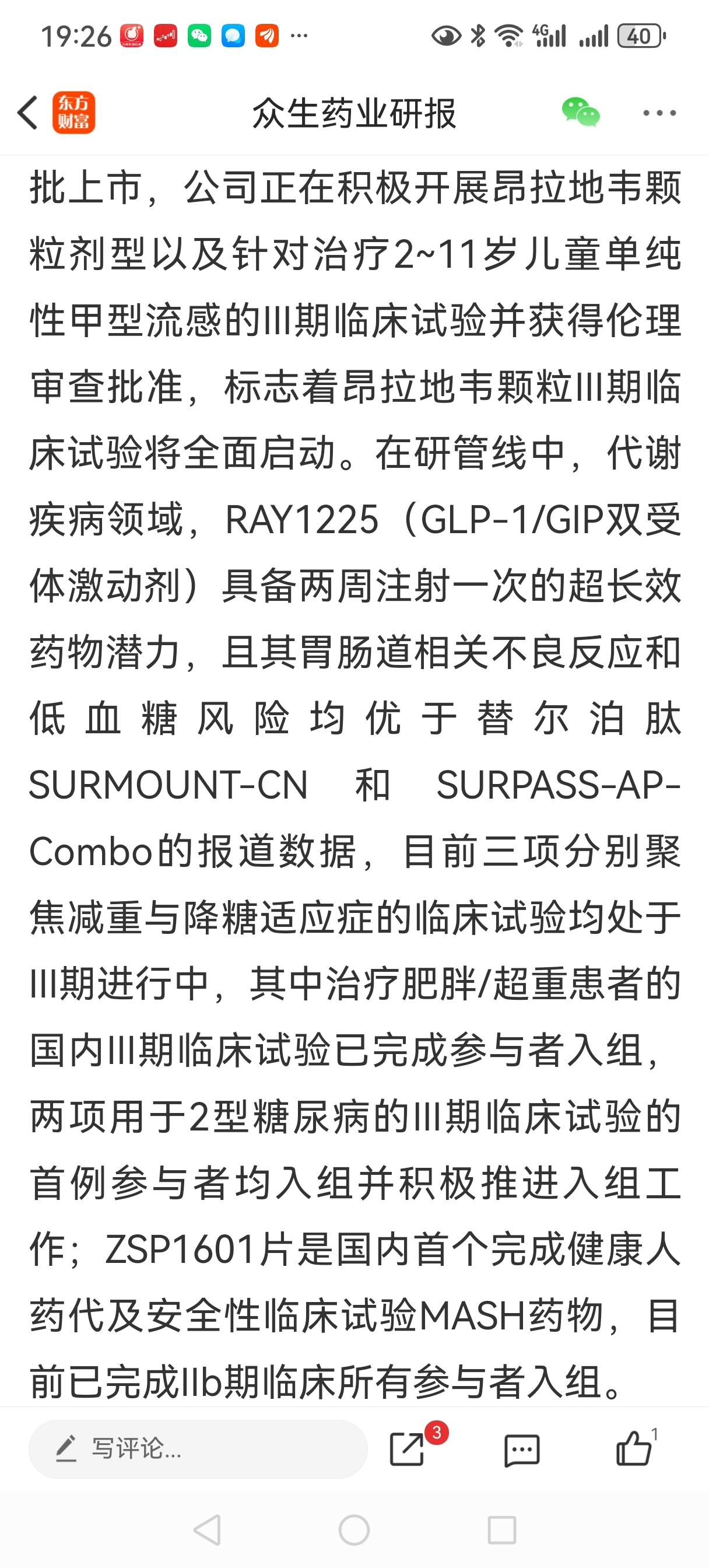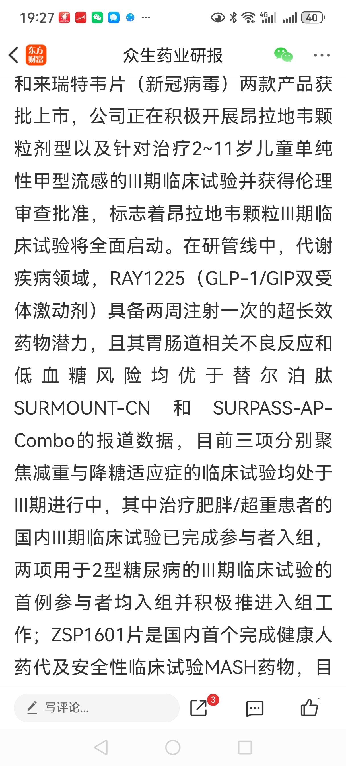 创新药中已有昂拉地韦片(甲型流感)和来瑞特韦片(新冠病毒)两款产品获批上市,公司正在积极开展昂拉地韦颗粒剂型以及针对治疗2~11岁儿童单纯性甲型流感的III期临床试验并获得伦理审查批准,标志着昂拉地韦颗粒III期临床试验将全面启动。在研管线中,代谢疾病领域,RAY1225(GLP-1/GIP双受体激动剂)具备两周注射一次的超长效药物潜力,且其胃肠道相关不良反应和低血糖风险均优于替尔泊肽SURMOUNT-CN和SURPASS-AP-Combo的报道数据,目前三项分别聚焦减重与降糖适应症的临床试验均处于III期进行中,其中治疗肥胖/超重患者的国内III期临床试验已完成参与者入组,两项用于2型糖尿病的III期临床试验的首例参与者均入组并积极推进入组工作;ZSP1601片是国内首个完成健康人药代及安全性临床试验MASH药物,目前已完成Ⅱb期临床所有参与者入组。(以上摘自甬兴证券的研报)