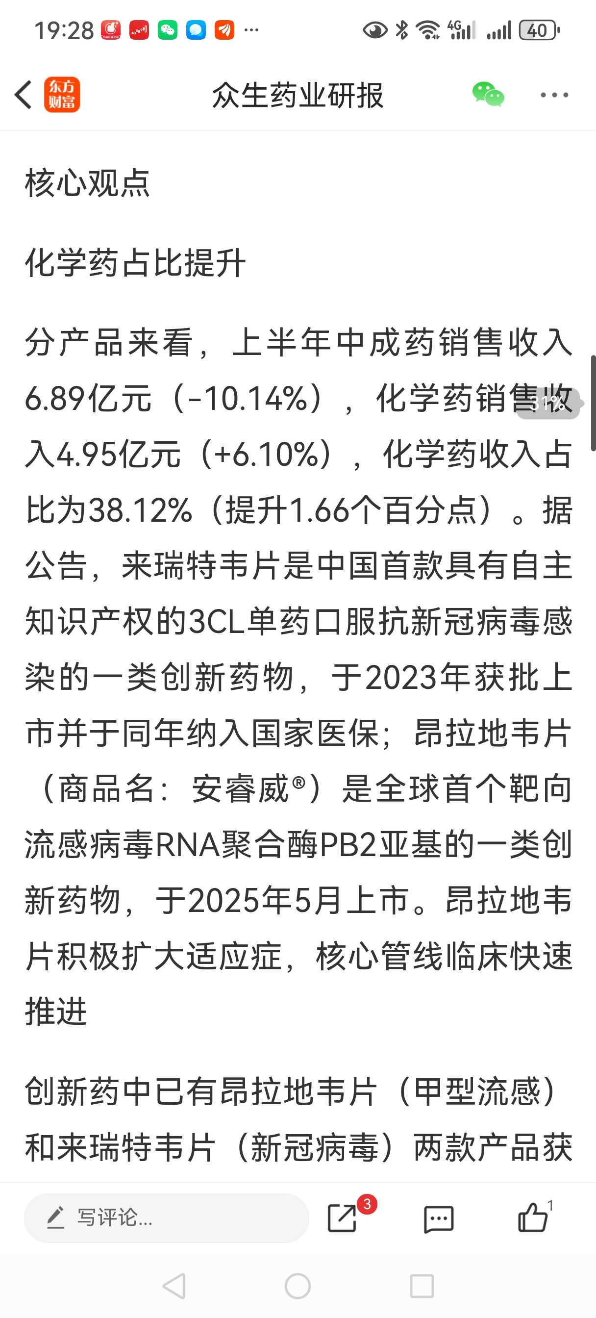 $众生药业(SZ002317)$ 据公告,来瑞特韦片是中国首款具有自主知识产权的3CL单药口服抗新冠病毒感染的一类创新药物,于2023年获批上市并于同年纳入国家医保;昂拉地韦片(商品名:安睿威)是全球首个靶向流感病毒RNA聚合酶PB2亚基的一类创新药物,于2025年5月上市。昂拉地韦片积极扩大适应症,核心管线临床快速推进