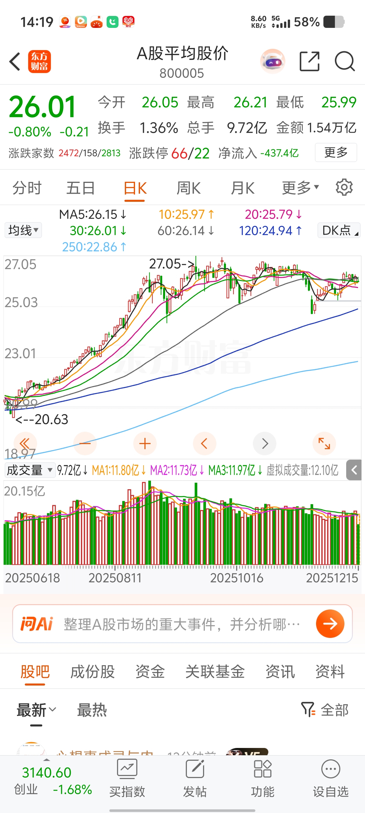 $创业板指(SZ399006)$ 平均股价跌了吗,天天说亏钱