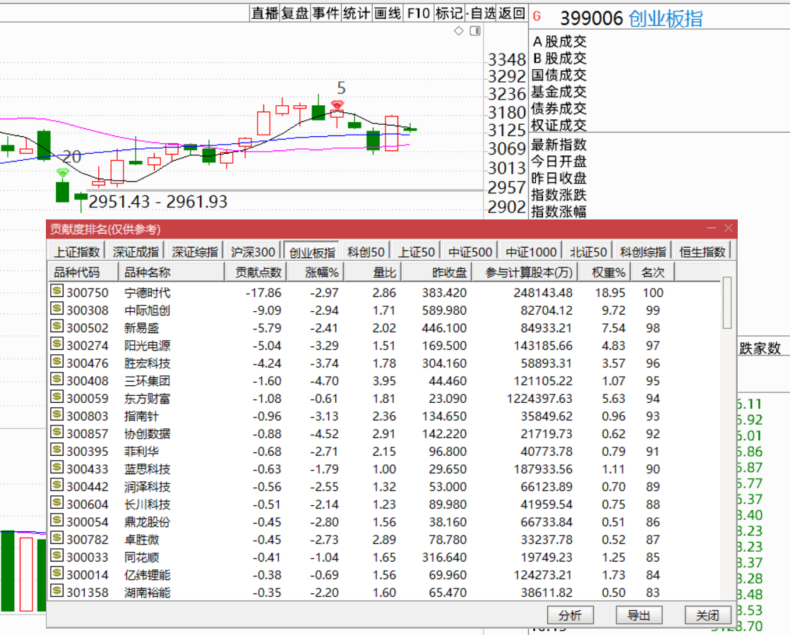 接下来创指不好过,目前领跌贡献榜的前几名,打开K线图,很清楚了,看架势,势必要领着创指回补下方的缺口乃至跌破前低。