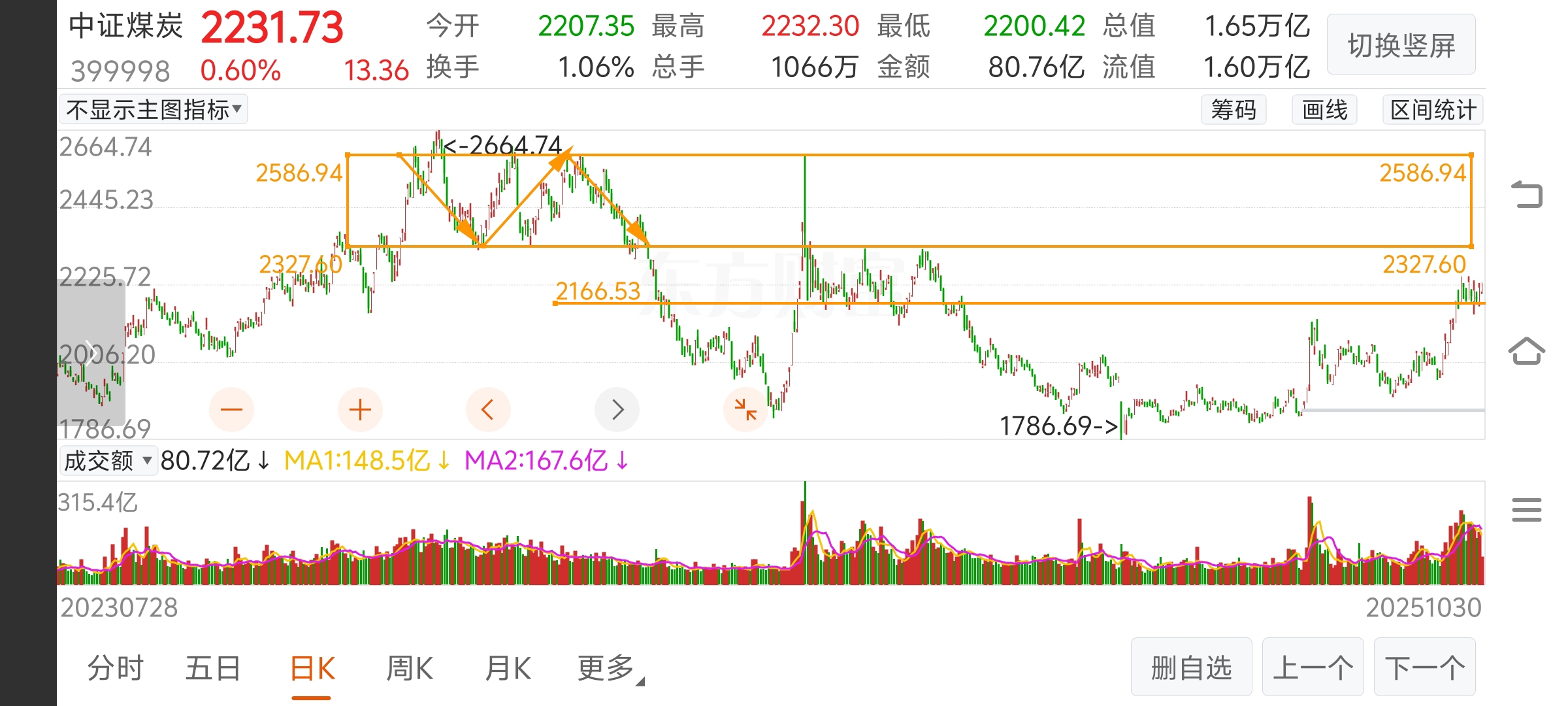 中证煤炭指数压力位再2330附近,2330点上方是有出货的,底下支撑位在2160